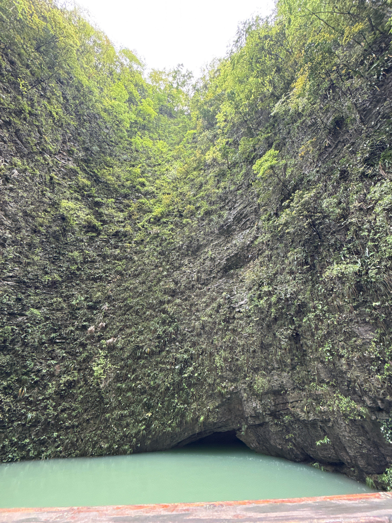 The image depicts a vertical cliff face covered in dense vegetation, likely moss and small plants, located in Zhangjiajie, China. A body of water, possibly a river or lake, is visible on the right edg…read more