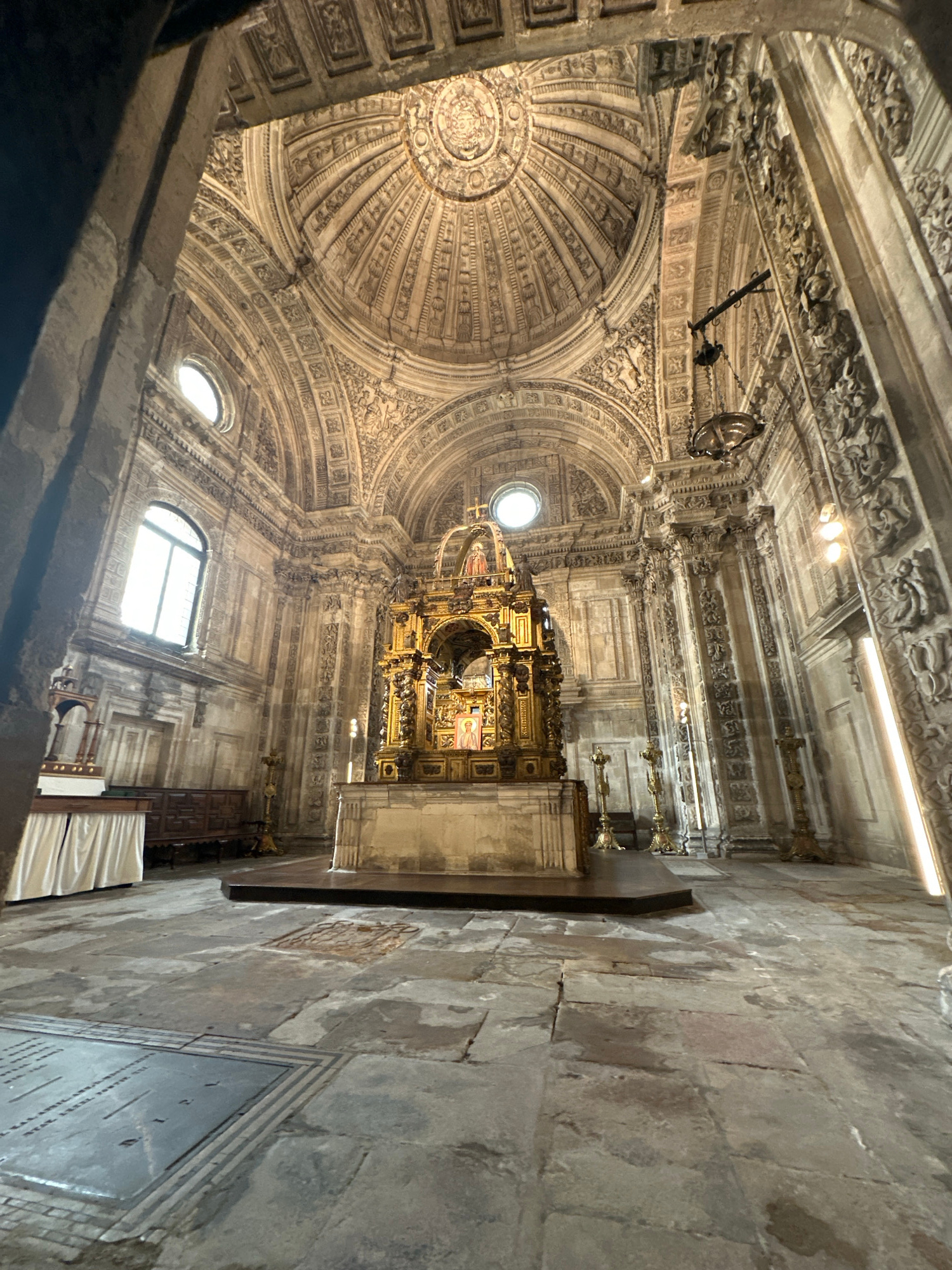 The image shows the interior of a cathedral in Oviedo, Spain. The architecture is ornate and features a high, decorated dome. There is a large, golden altarpiece at the center of the frame. The walls…read more