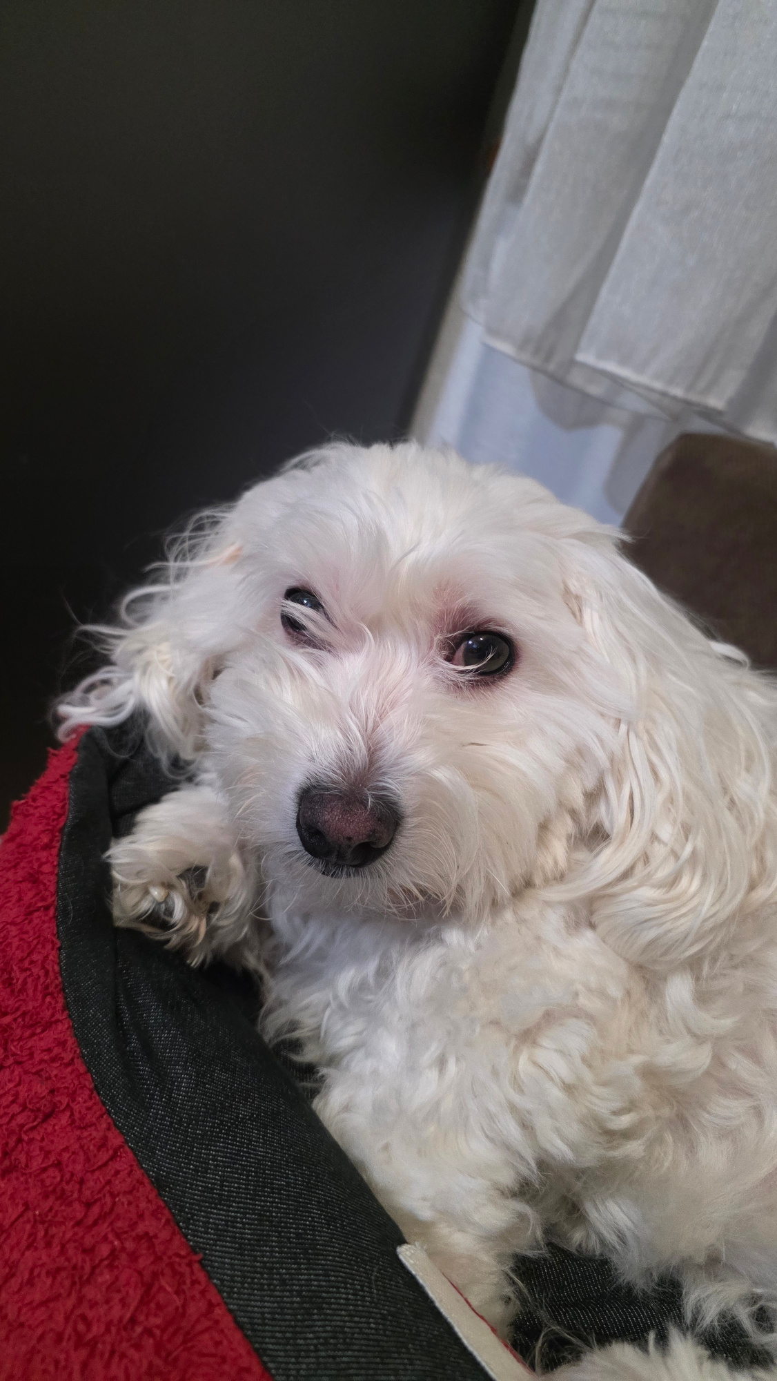 A white, curly-haired dog is lying on a bed or cushion with a red and black cover. The dog is oriented diagonally across the frame, with its head in the upper center and its body extending towards the…read more