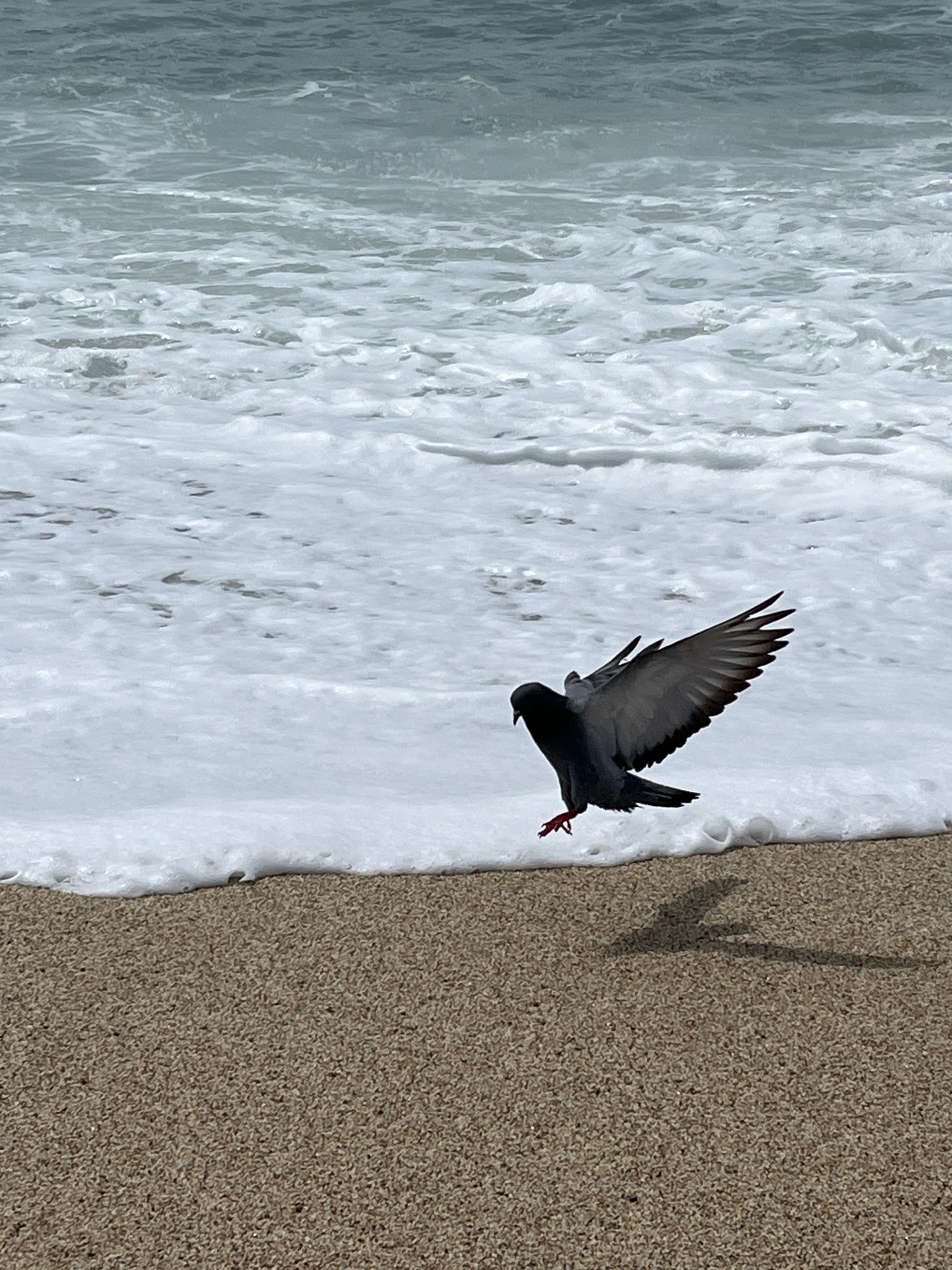 A pigeon is in flight over the sandy beach and waves of the Mediterranean Sea in Alanya, Turkey. The pigeon's wings are spread, its head is pointed downward, and its red feet are visible. The sand isβ¦read more