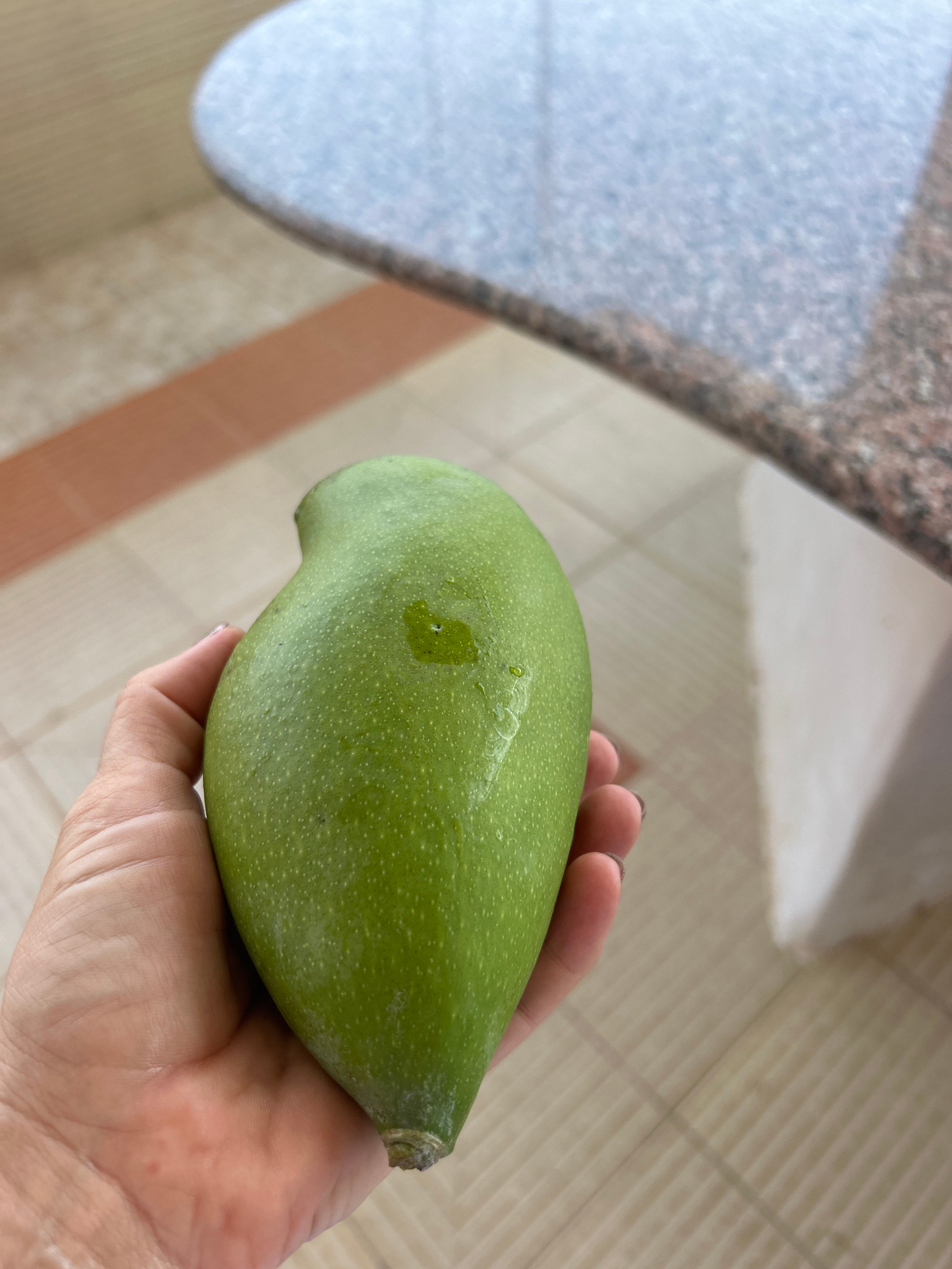 A hand holds a green mango in front of a beige tiled surface, likely a floor, inside a building in Puttaparthi, India. A gray countertop is in the background to the left of the mango. The mango has a…read more