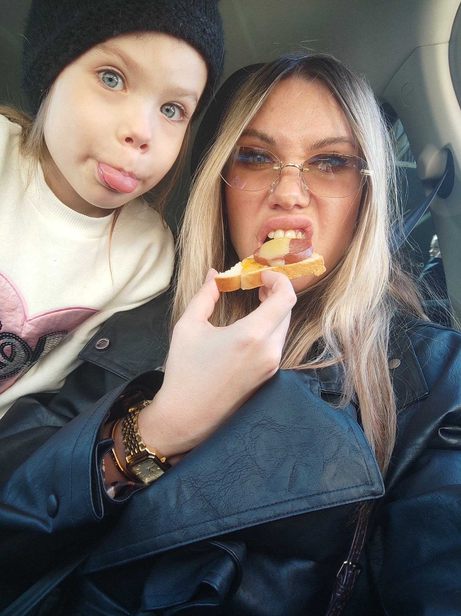 The image captures a woman and a young girl, likely in the interior of a car, potentially in Izhevsk, Russia (though this cannot be definitively confirmed without additional context). The girl, wearin…read more