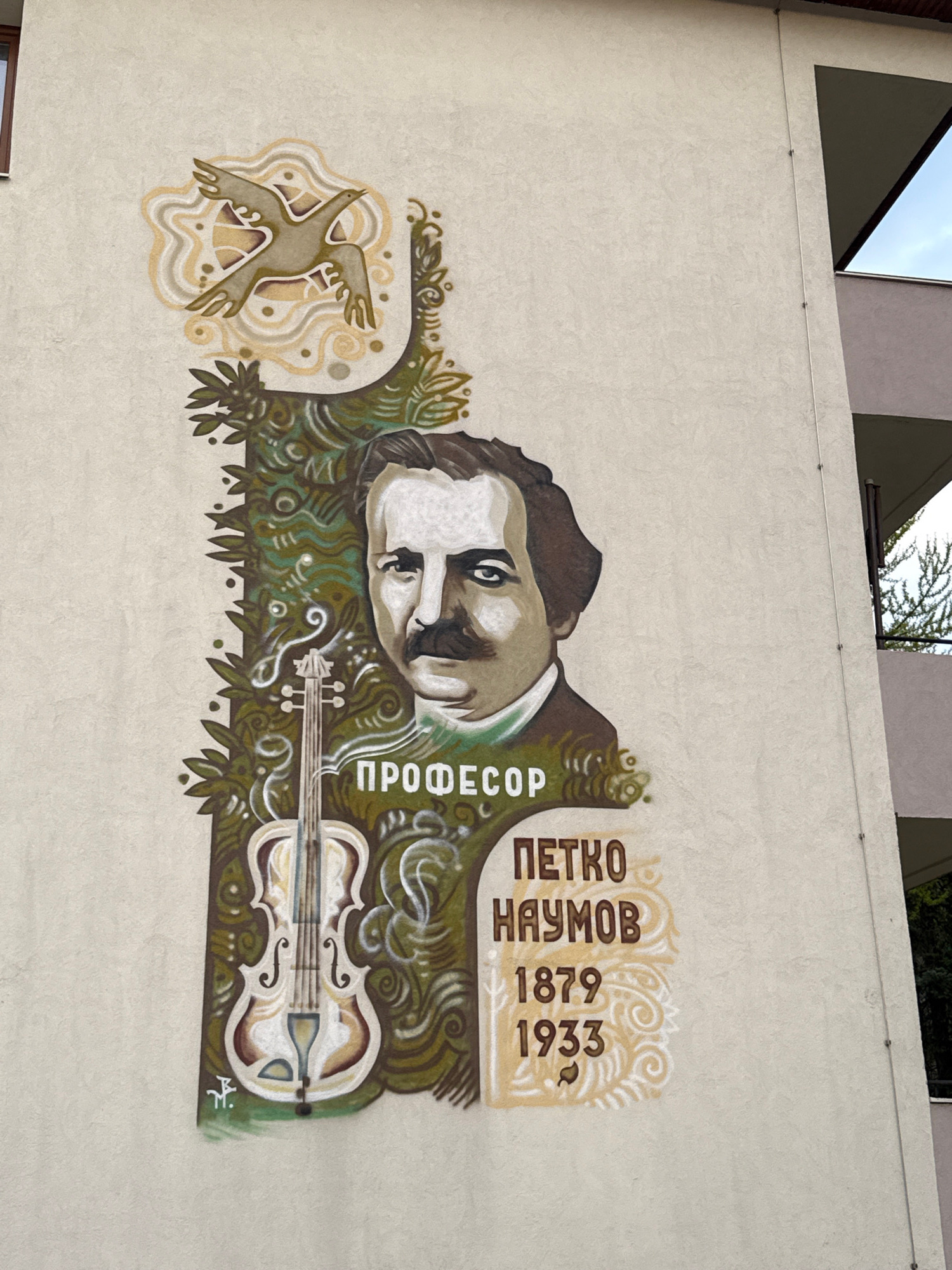 This media file captures a vibrant mural painted on the exterior wall of a building, likely located in Berkovitsa, Bulgaria. The central subject of the mural is a stylized portrait of a man, depicted…read more