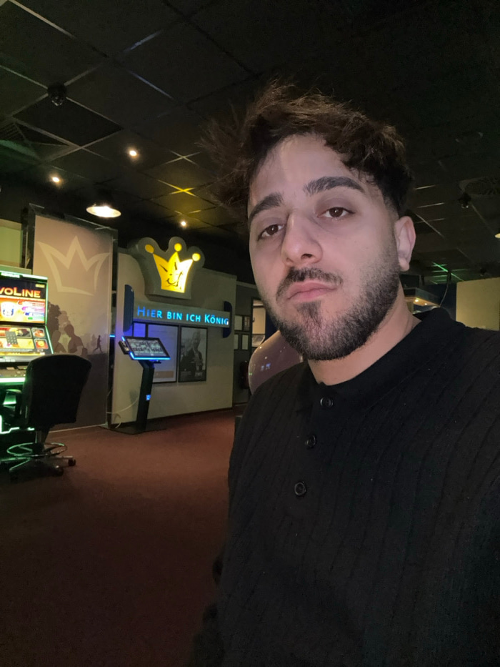 A man with dark hair and a beard poses indoors. Behind him are arcade games and a sign in German, partially reading "Hier bin ich konig" ("Here I am king"). The room appears dimly lit with patterned cā¦read more