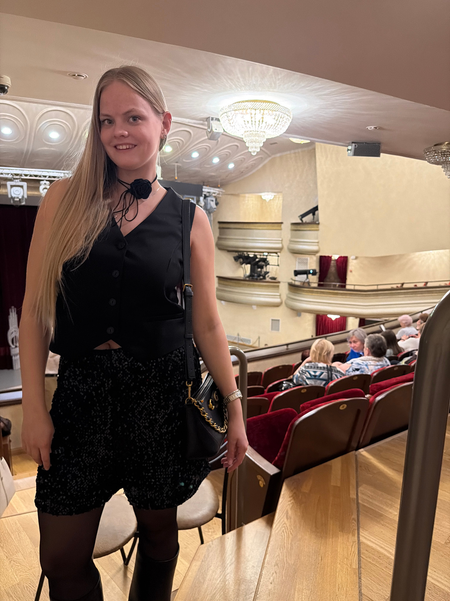 The image shows a woman posing inside what appears to be a theater. The architectural design and ornate detailing visible in the background, particularly the elaborate chandeliers and patterned walls,…read more
