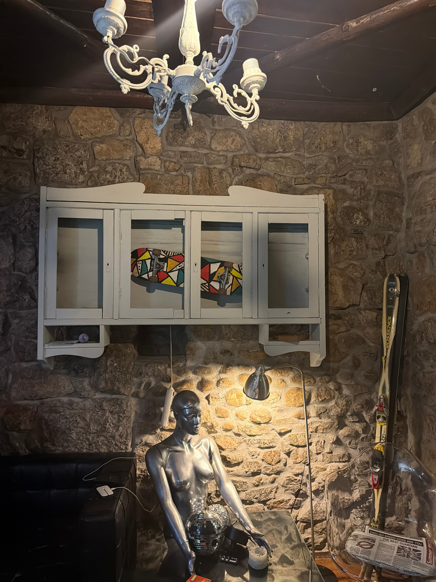 The image shows an interior in Podgorica, Montenegro, featuring a wall made of rough, light-colored stone. A white wooden shelf unit with three sections displays two skateboards with colorful graphic…read more