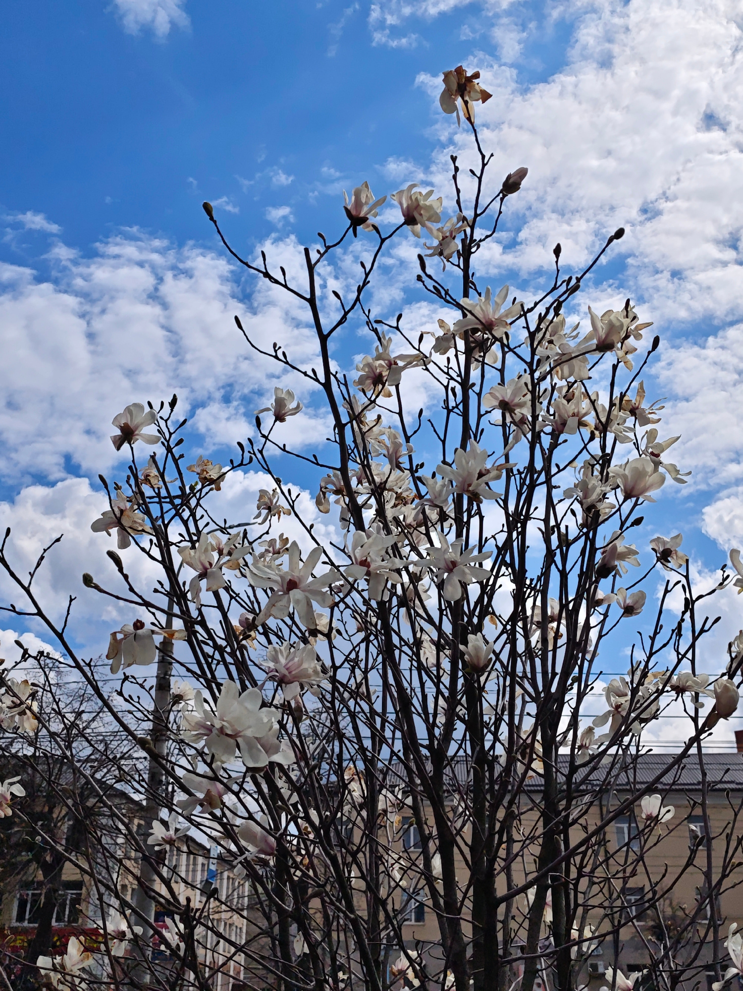 The image shows a magnolia tree in bloom in Vinnytsia, Ukraine. The tree has many bare branches with white and pink flowers. Some flower buds are also visible. The backdrop is a bright blue sky with f…read more