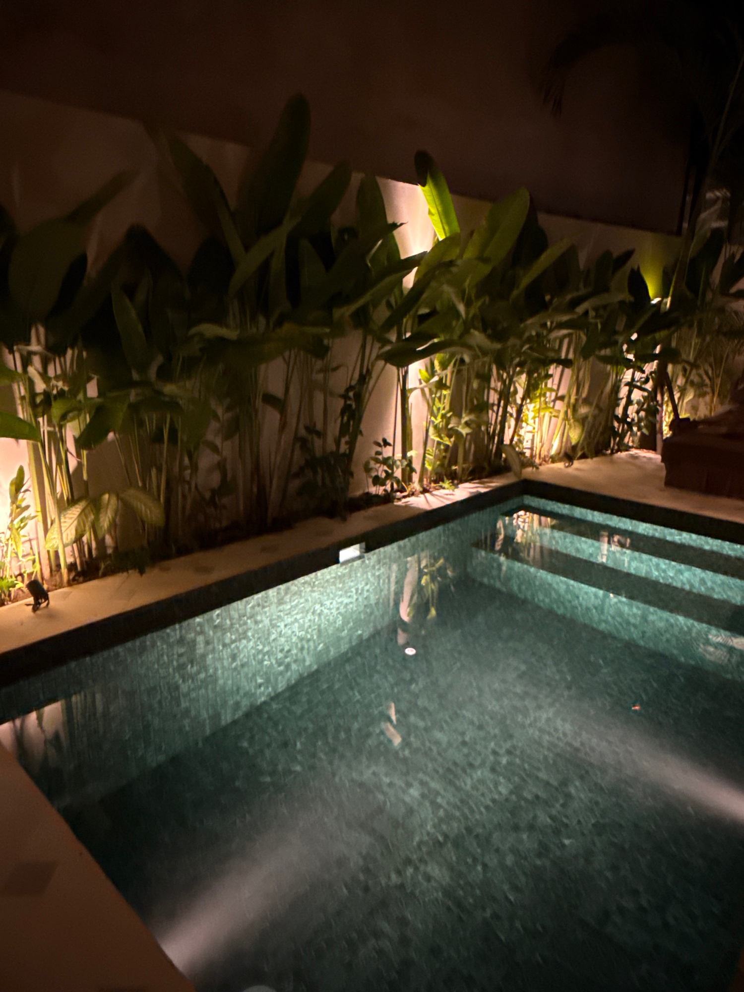The image captures a swimming pool in Kuta Selatan, Indonesia, at night. The pool is tiled with a mosaic pattern. Reflected light streaks across the surface of the water. On the pool's edge, greenery…read more