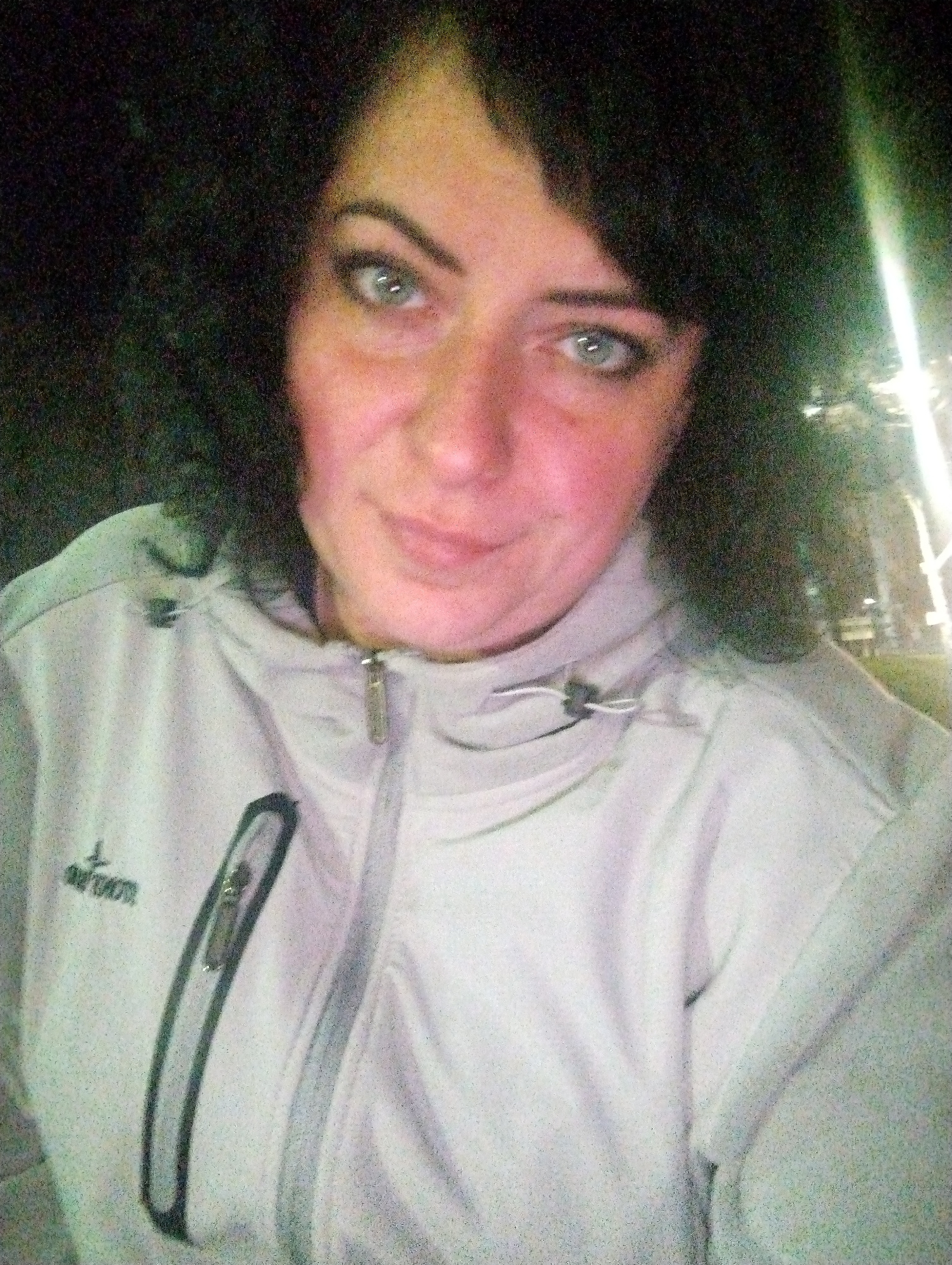A woman is shown in a selfie. She has dark curly hair and light-colored eyes. She is wearing a light-colored jacket with a zipper. The background is dark, with some light suggesting a city environment…read more
