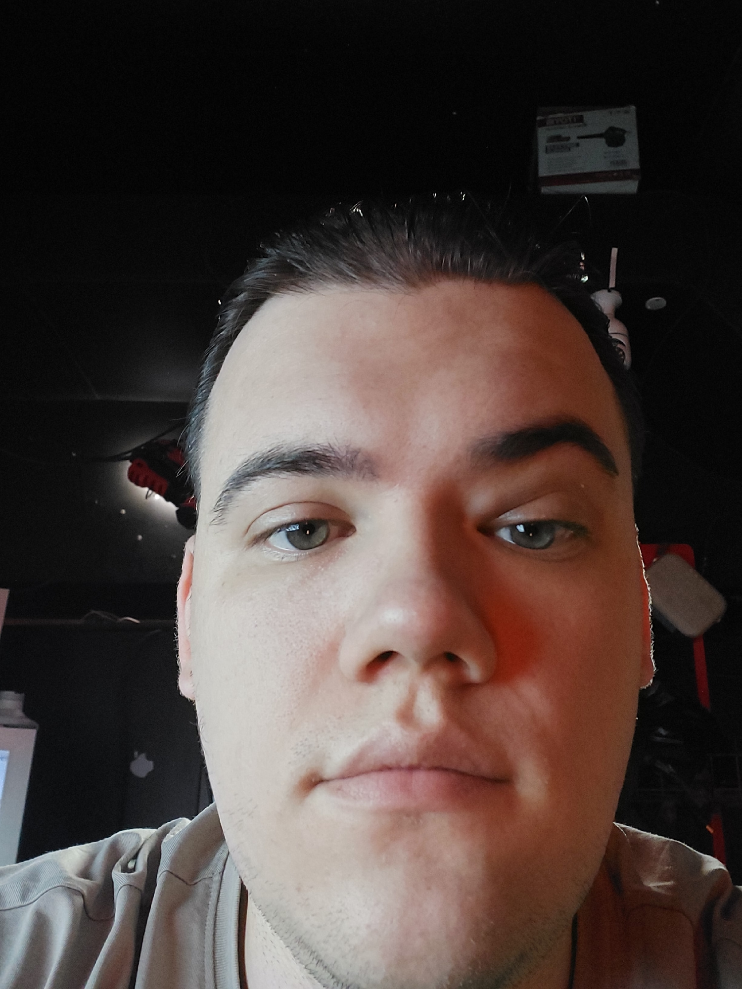 A close-up, slightly rotated image of a man's face. He has short, dark hair, light skin, and green eyes. He appears to be indoors in a dimly lit room, as evidenced by the black background. A monitor with an Apple logo is visible in the upper left corner. A red object, possibly footwear, is vaguely discernible in the background. A small cardboard box with an image of a tool or implement is on the ground. There is no indication in the image that suggests this was taken in Tashkent, Uzbekistan. | Open Wire