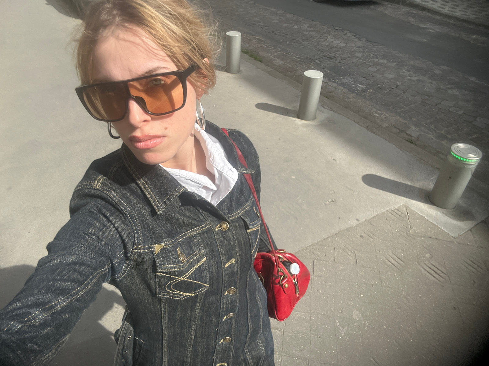 A woman in a denim jacket, a white collared shirt, and sunglasses is captured in an upside-down close-up shot outdoors. She wears hoop earrings and a red purse crosses her body. The background consist…read more