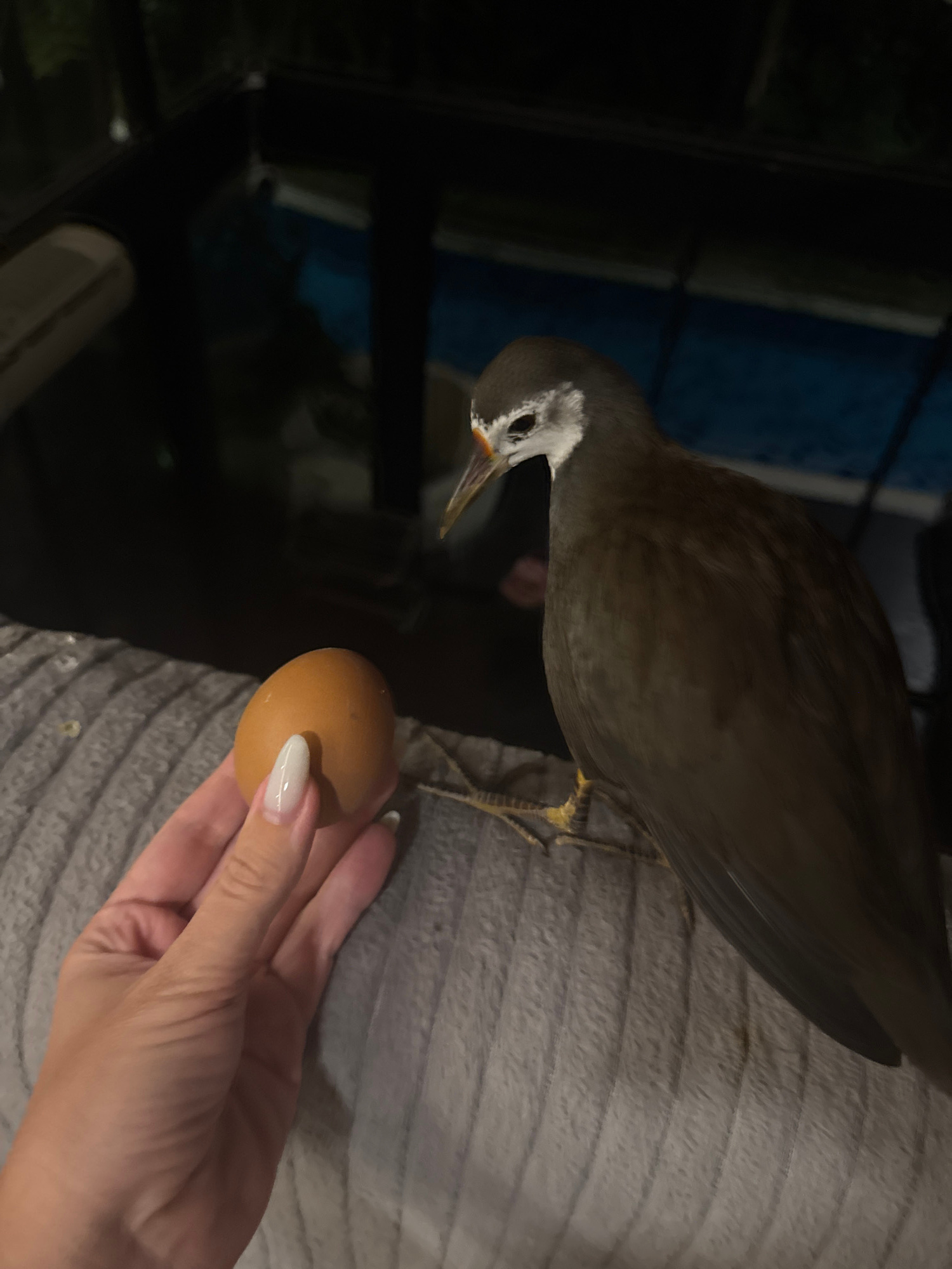 The image captures a close-up interaction between a bird and a human hand holding an egg in a dimly lit, possibly indoor or sheltered setting in Kuta Selatan, Indonesia. The primary subjects are a bi…read more