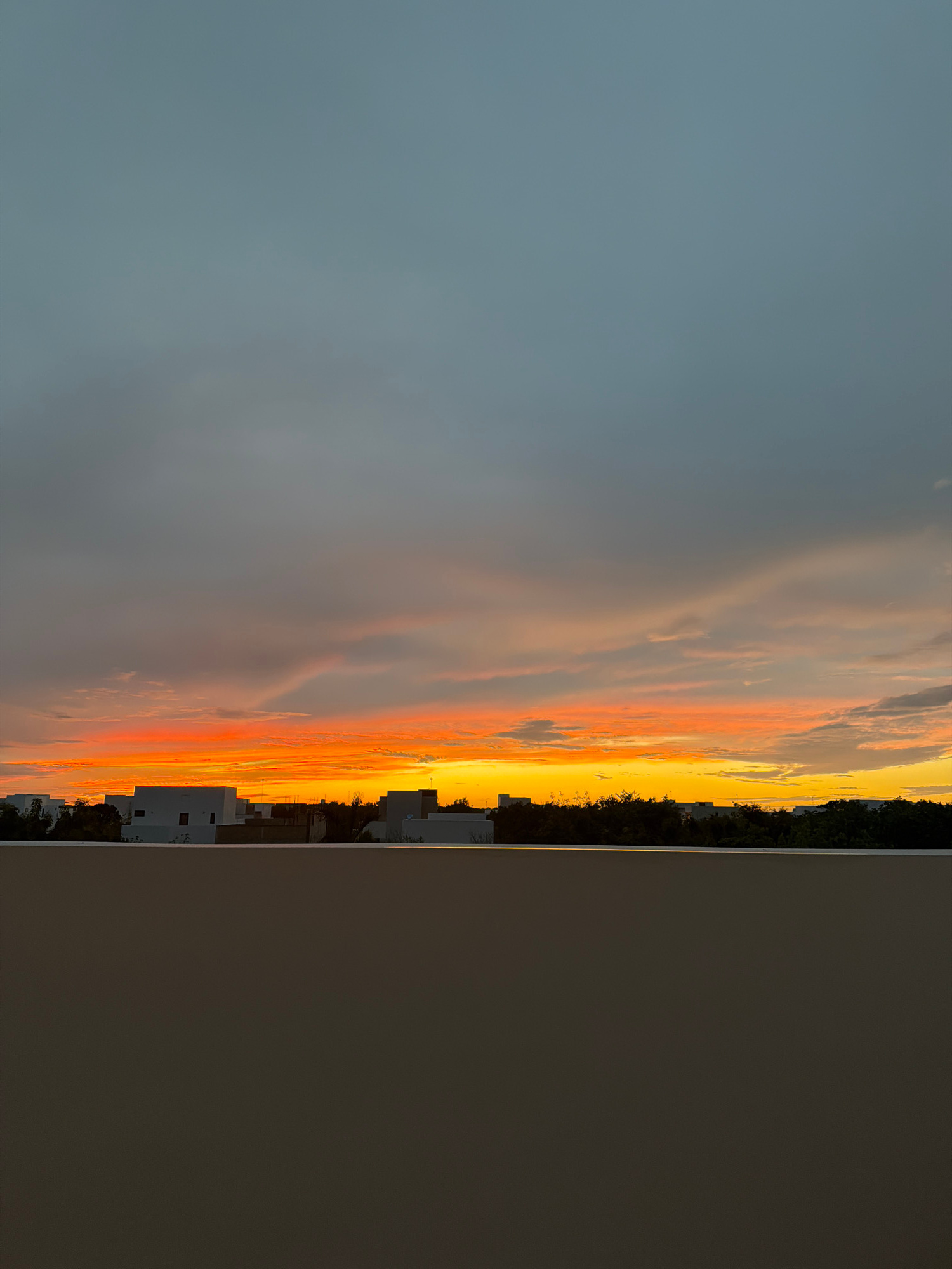 A photograph of a colorful sunset viewed from Cancun, Mexico, displays a clear sky transitioning to fiery oranges and yellows near the horizon. Clouds are visible on the left side of the frame and ble…read more