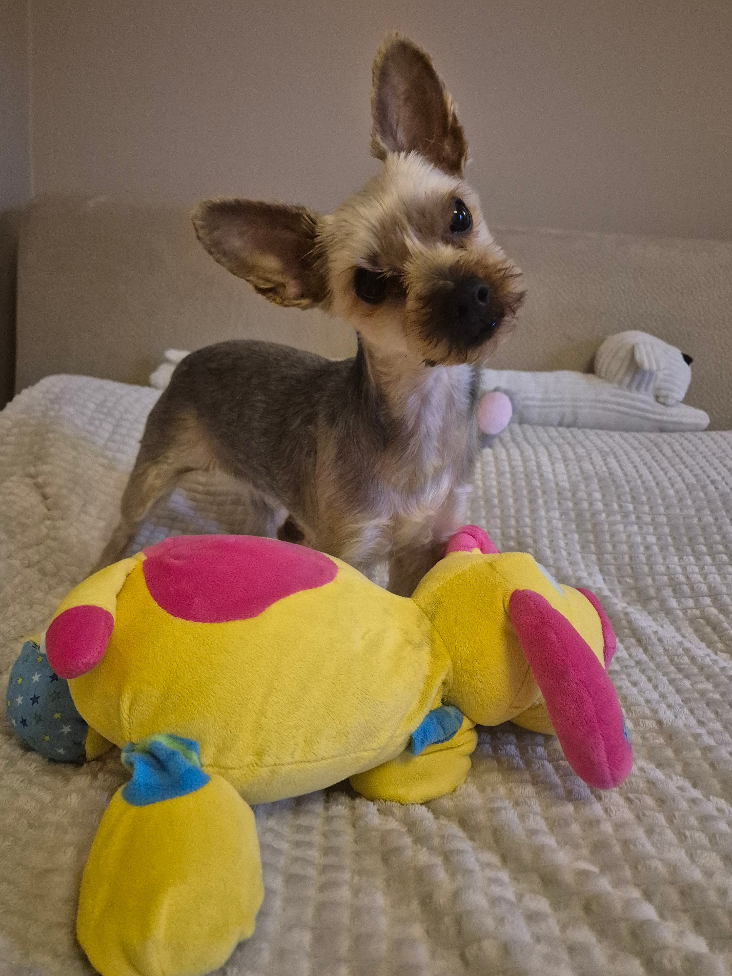 The image displays an indoor scene featuring a small dog and two stuffed toys on a textured, light-colored blanket or throw, likely covering a sofa or bed. A small dog, possibly a Yorkshire Terrier orβ¦read more