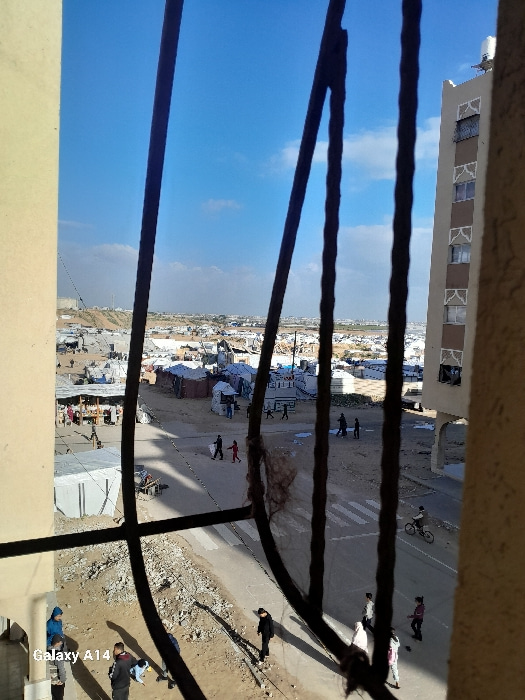 A view through a metal balcony railing reveals a street scene with people walking and riding a bicycle. In the background, a refugee camp is visible, composed of many tents and temporary structures. A…read more