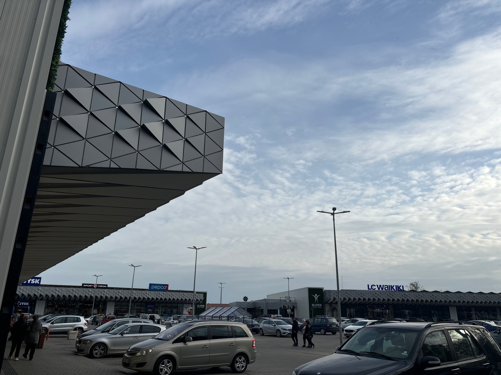 The image shows a parking lot in front of a shopping center in an unknown city. The sky is partially cloudy. The facade of the building is decorated with gray triangular panels. Various cars are parke…read more