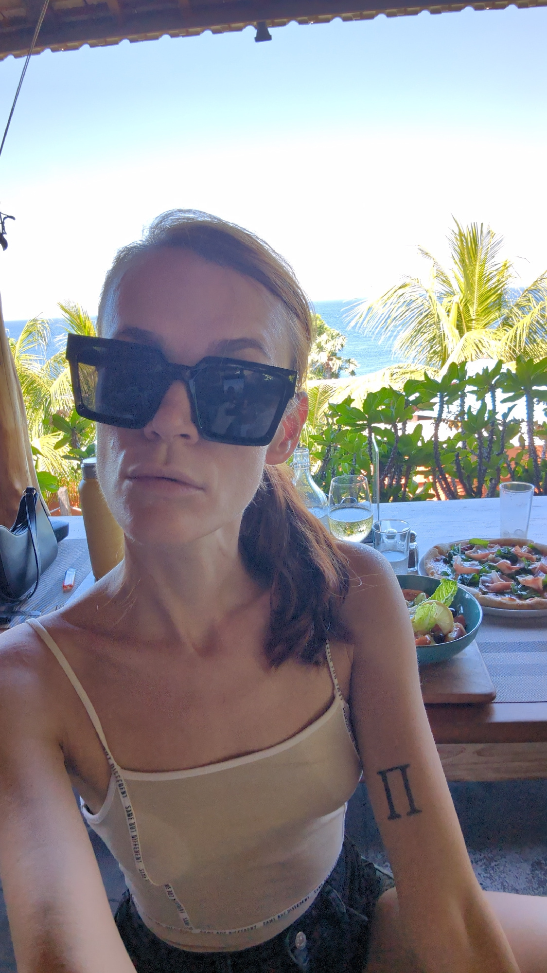 A tanned woman with light brown hair pulled back into a low ponytail is seated at a table at a restaurant in Abang, Indonesia, wearing black sunglasses and a white tank top. Her left arm, resting on t…read more