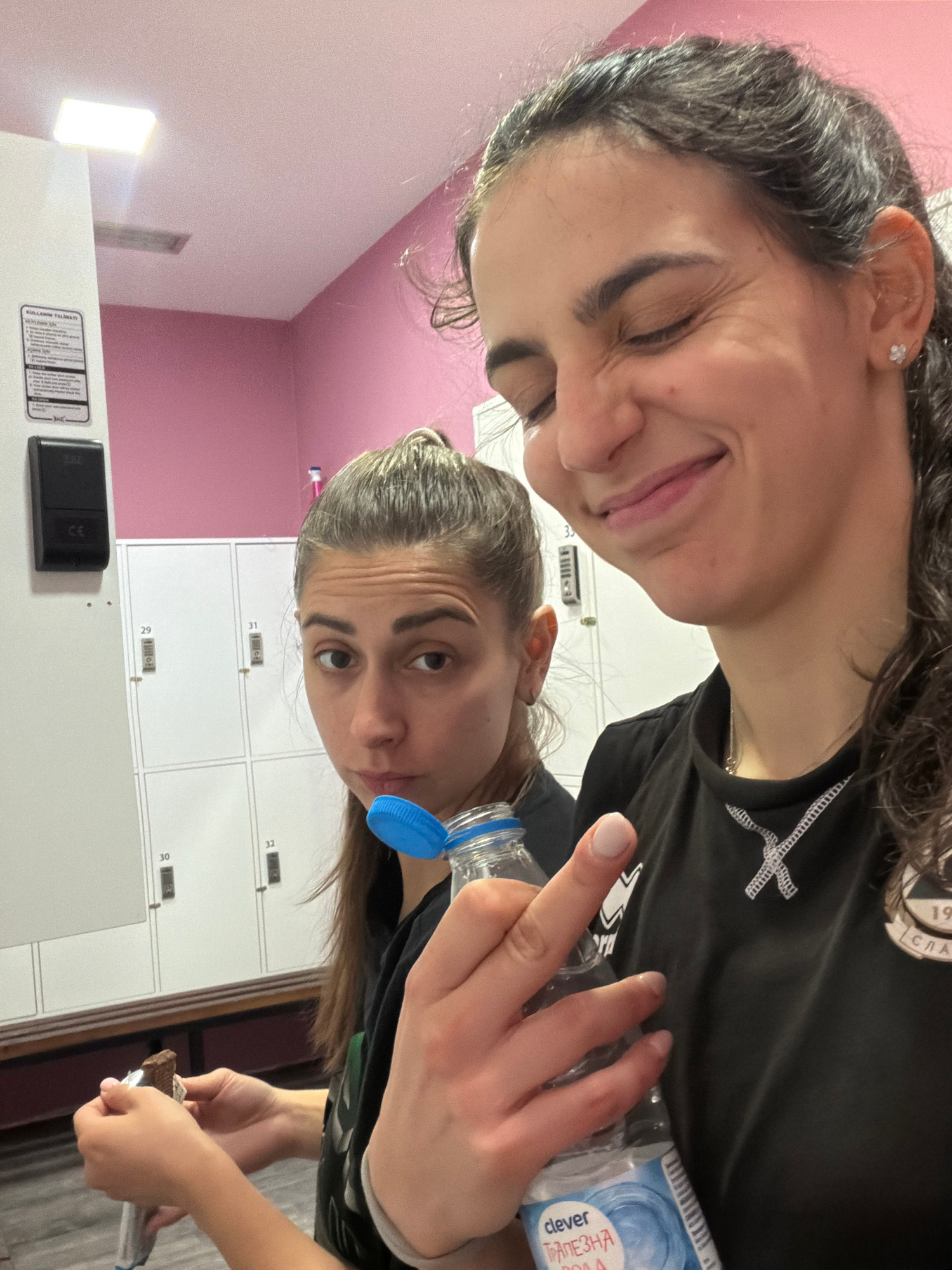 Two young women are posing for a selfie in what appears to be a locker room. The room has white lockers with numbering (29-32 visible) against a pink and white wall. One woman is drinking from a "clev…read more