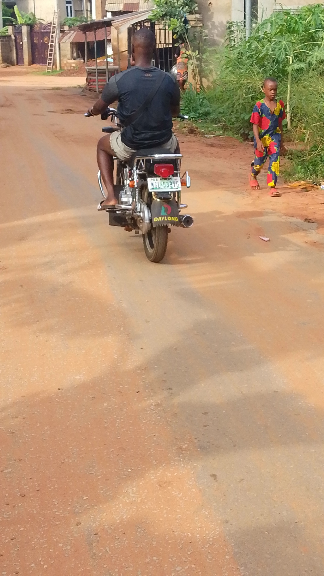 The photo shows a man riding a Daylong brand motorcycle away from the camera on a dirt road in what appears to be a residential area of Enugwu-Ukwu, Nigeria. The license plate on the motorcycle readsβ¦read more