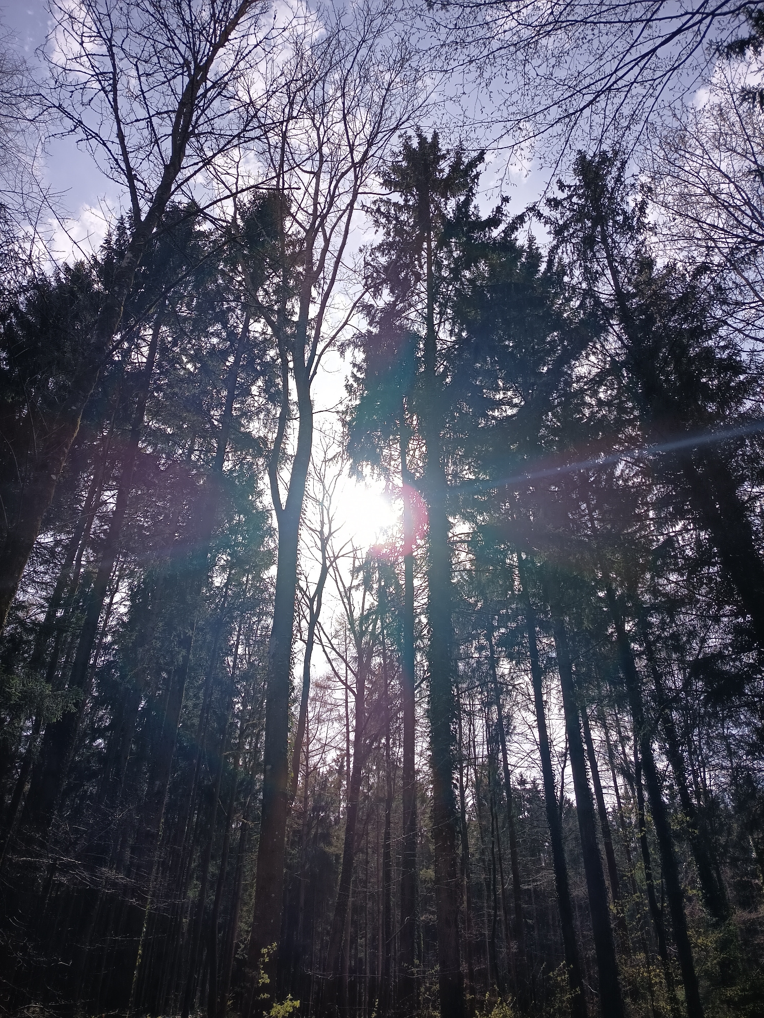 The image depicts a low-angle view of a forest in Härkingen, Switzerland. Tall, dark-green fir trees dominate the scene, their silhouettes contrasted against a bright, overcast sky with hints of blue.…read more