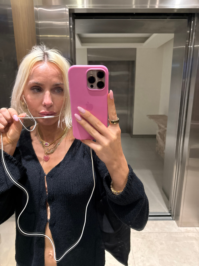 A blonde woman in a black knit sweater takes a selfie in front of a stainless steel surface, likely an appliance. She holds a pink iPhone case. She wears layered gold necklaces and a ring on her right…read more