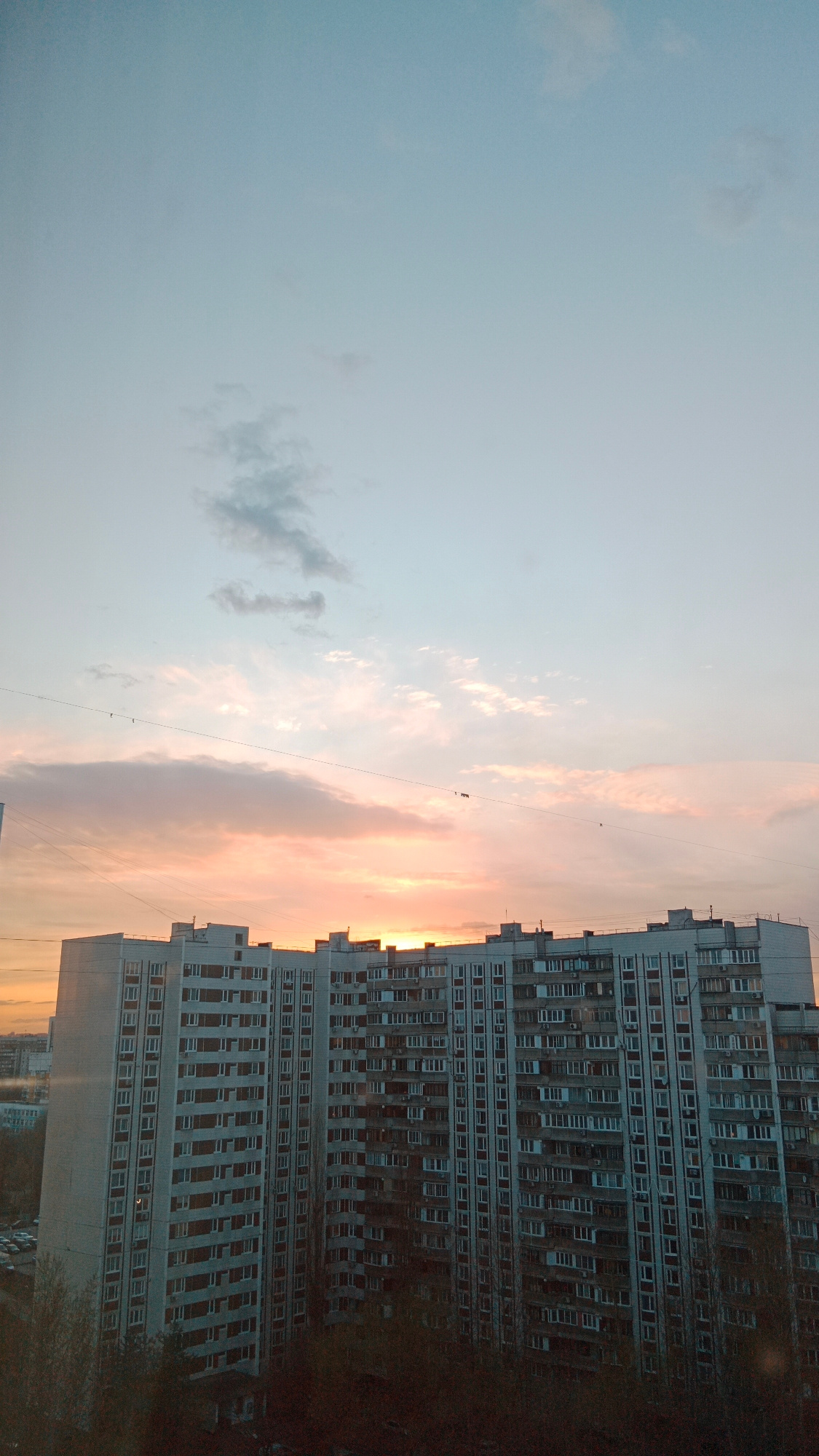 The image depicts a large apartment building in Moscow, Russia, likely from a high vantage point. The building is multi-storied with a repetitive pattern of windows and balconies, typical of Soviet-er…read more