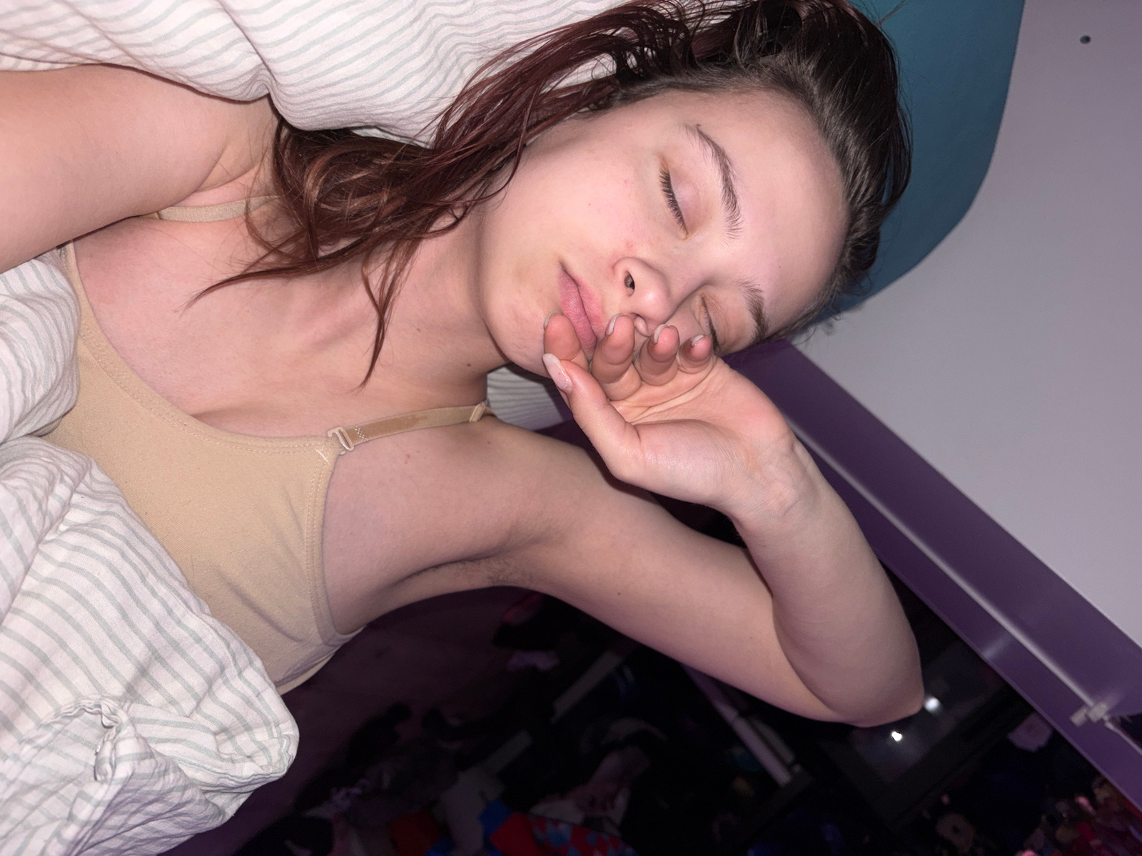 A woman with brown hair lies in a bed covered in a striped sheet and pillow. She is wearing a beige top. Her eyes are closed, and her hand is partially covering her face. The location is not discernib…read more