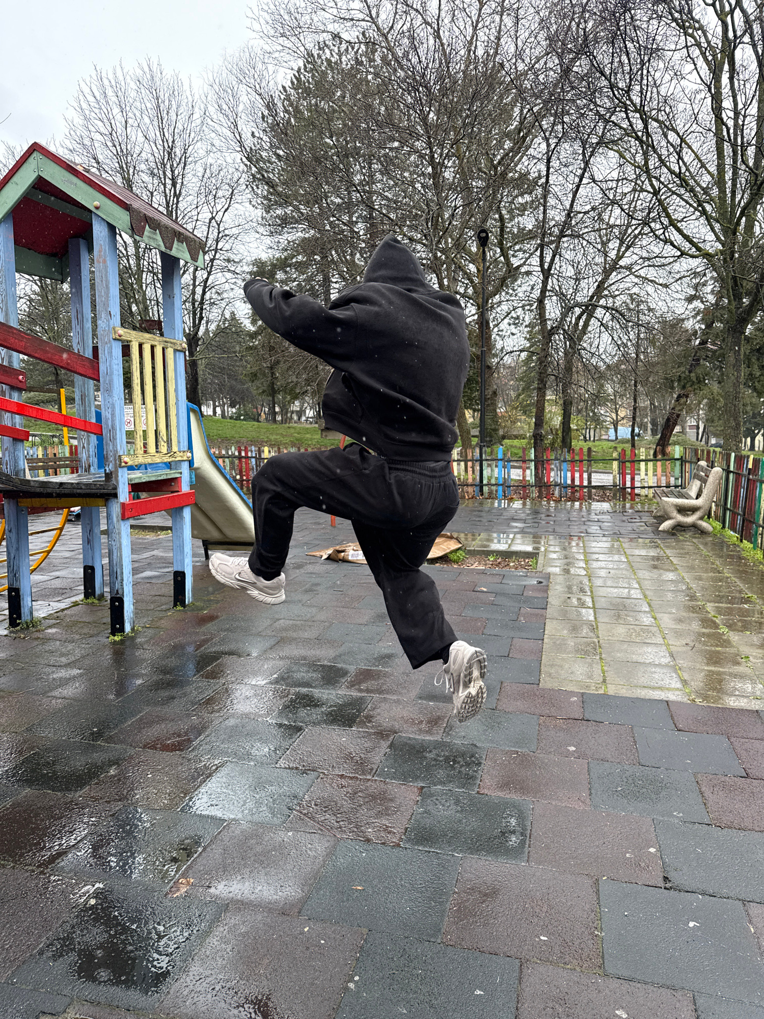 A person wearing a black hoodie and black pants is in motion on a wet, brick-paved surface adjacent to a playground. The person's right leg is extended in front, while the left leg is extended behind.…read more