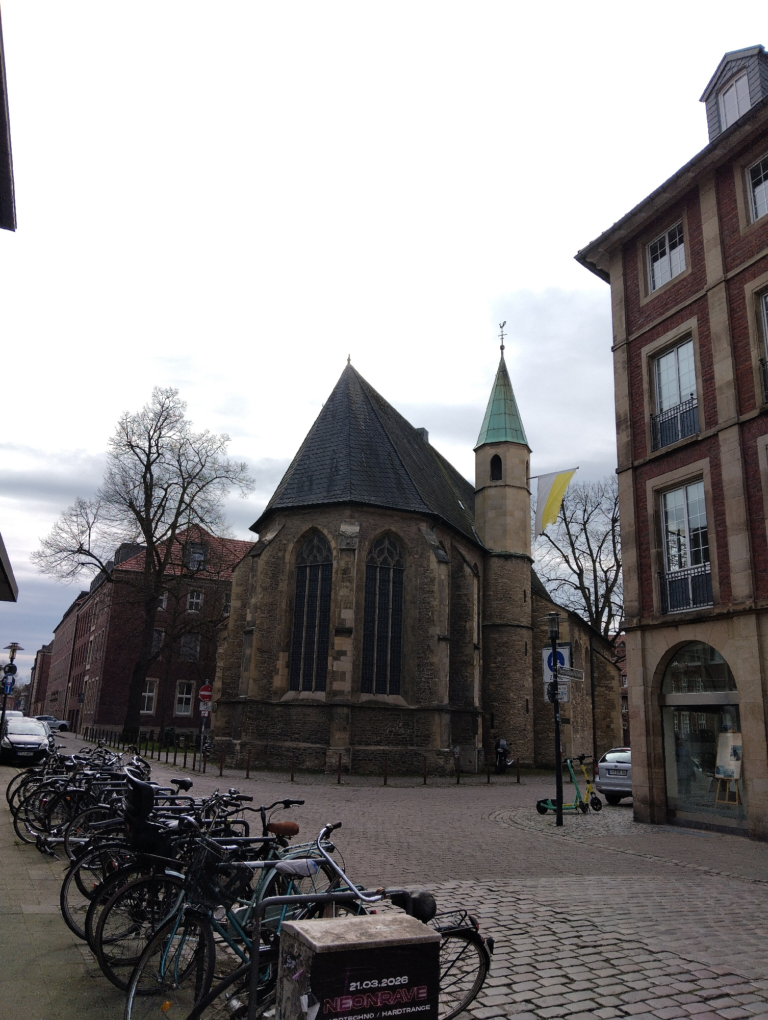 The image shows a street scene in Münster, Germany, featuring the Aegidii church prominently. The church, constructed of stone with a steeply pitched roof and a small, pointed spire, is positioned at…read more