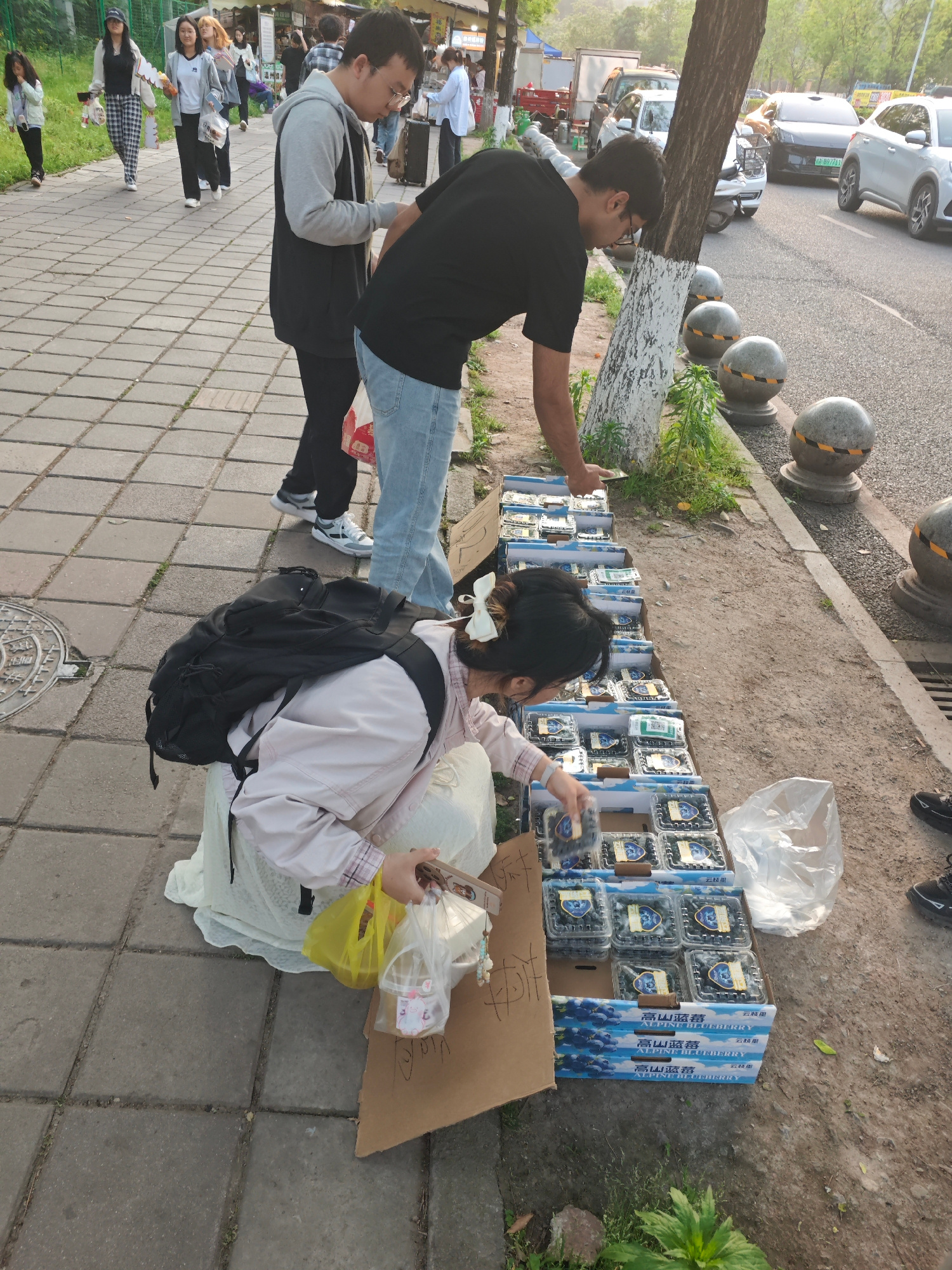 The image shows a street scene with people and items indicating a sale. A woman kneels near boxes of "Alpine Blueberry" in Chinese and English text on a cardboard box. She is wearing a light-colored j…read more