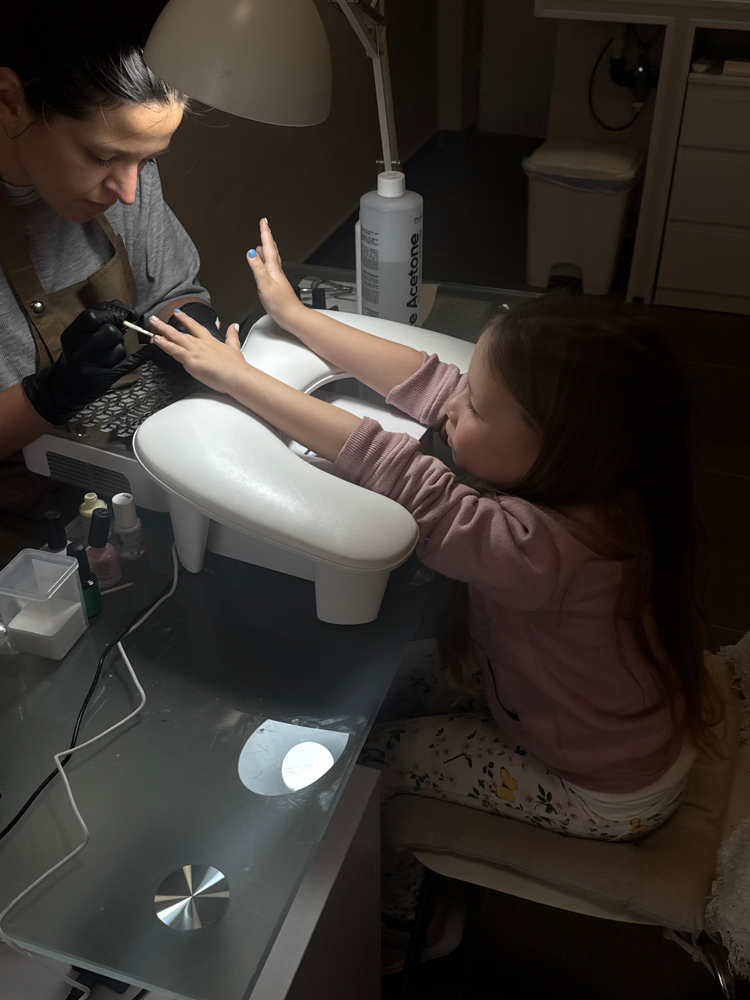 A young girl is receiving a manicure. She is wearing a light pink sweatshirt and floral print pants. She is leaning forward with her hands resting on a white manicure station. A manicurist is applying…read more