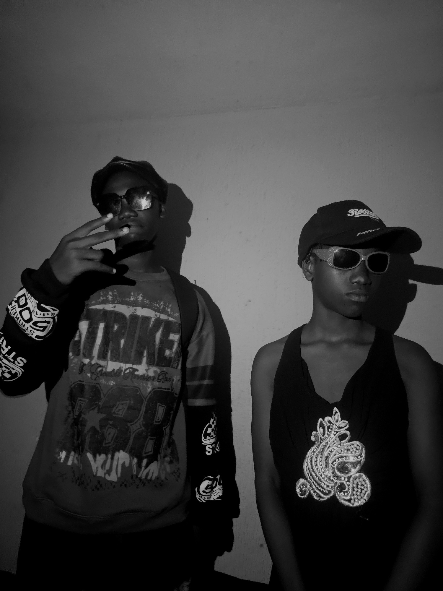 Two people are posing indoors against a light-colored wall in Nkwelle, Nigeria. The first person, located on the upper right side of the frame, is wearing a dark tank top adorned with a decorative bea…read more
