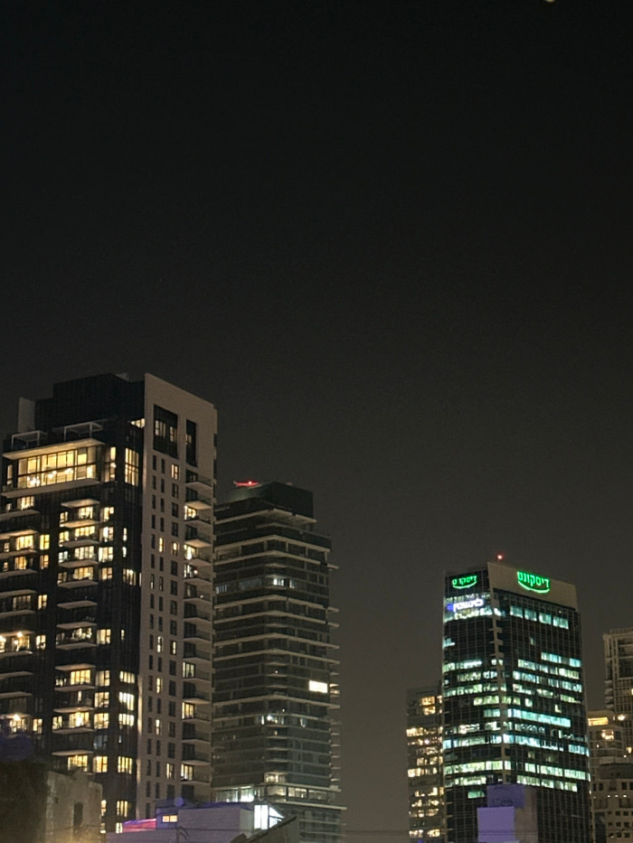 The image displays an urban night scene in Tel Aviv, Israel, showcasing several modern high-rise buildings against a dark, clear sky. The time of day is night, indicated by the uniformly dark sky and…read more
