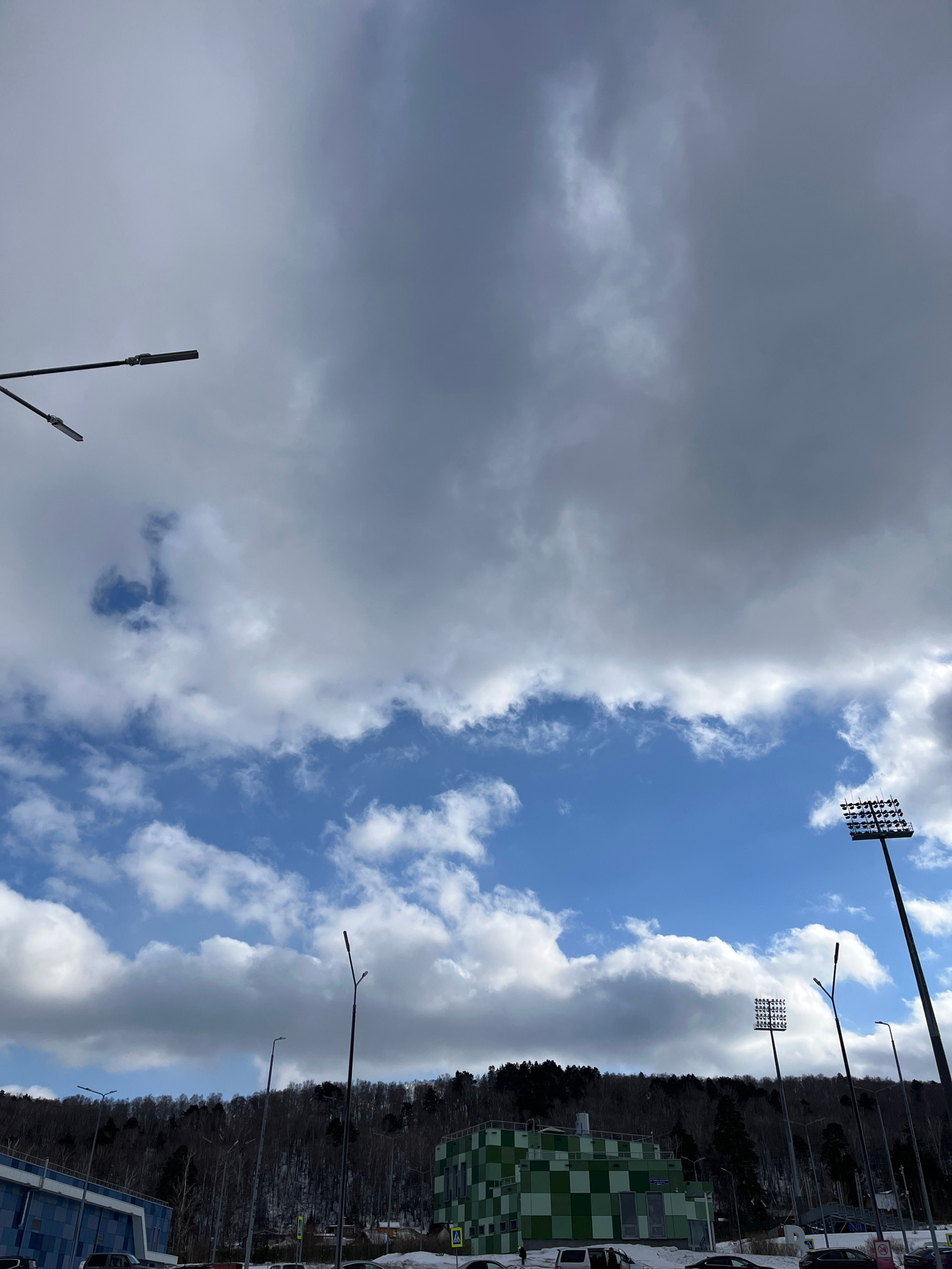 The image depicts a partially cloudy sky above a landscape in Krasnoyarsk, Russia. The sky is bisected; one side shows a dense, grey cloud cover, and the other shows a clear blue sky with scattered wh…read more