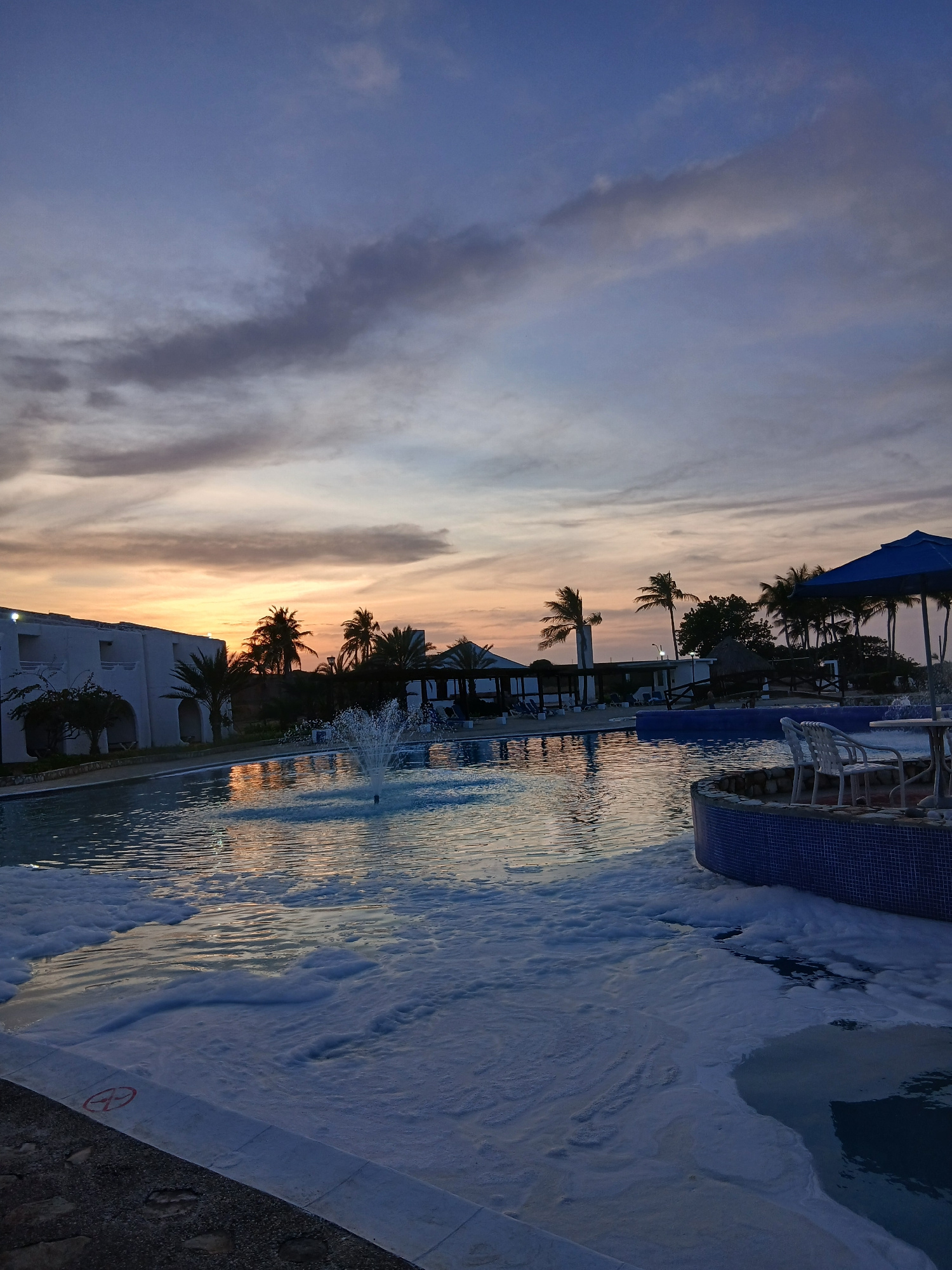 The image depicts a twilight scene at what appears to be a resort in Altagracia, Venezuela. The sky exhibits a gradient of colors, transitioning from orange near the horizon to hues of blue and gray o…read more