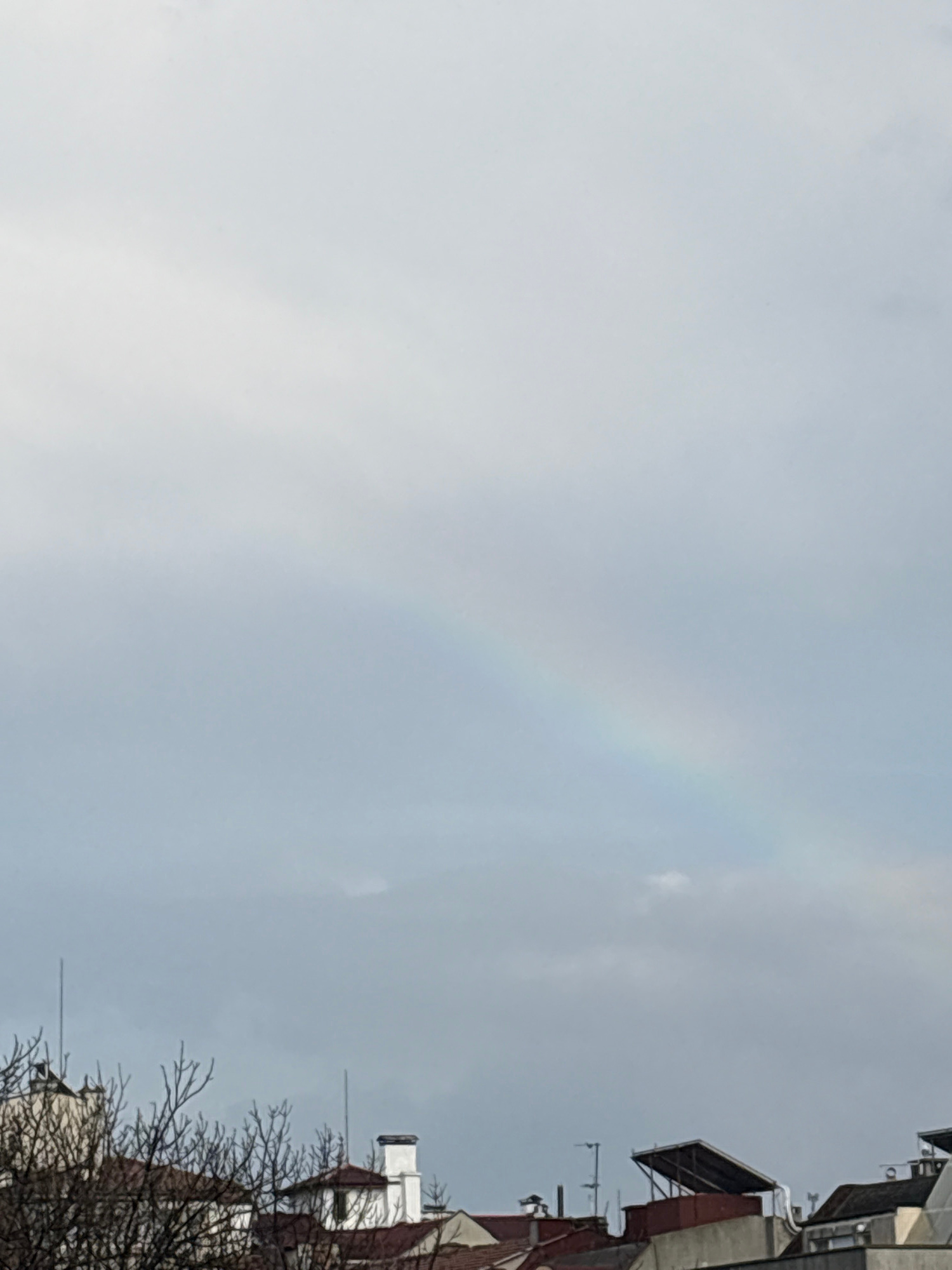 The image shows a cloudy sky with a faint rainbow arching across it. In the bottom right corner, the tops of buildings and bare tree branches are visible. Based on the architectural style and the pres…read more