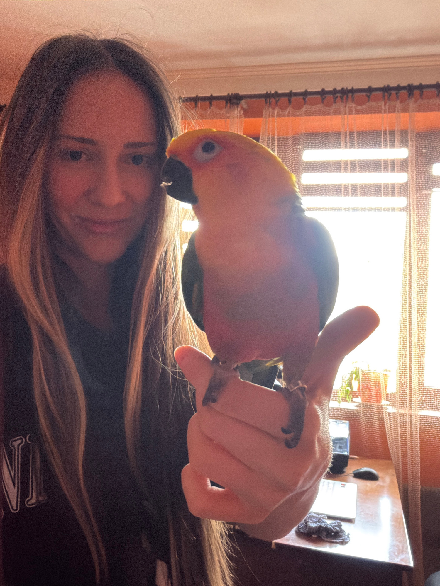 A fair-skinned person with light brown hair is holding a brightly colored parrot. The parrot has a yellow-orange head and a dark beak. The person is holding the parrot with their right hand. The photo…read more