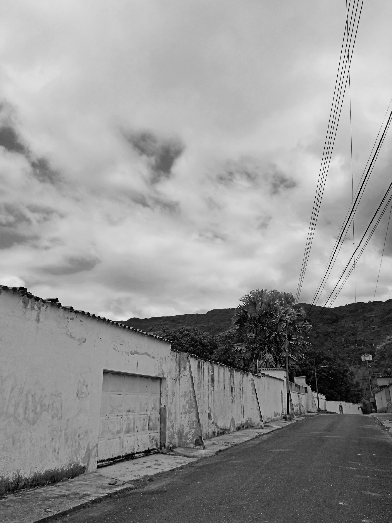 The image depicts a street scene in Montalbán, Venezuela. A long, high, aged white wall runs along the left side of the street, with a large garage door visible towards the front. The road is asphalt…read more