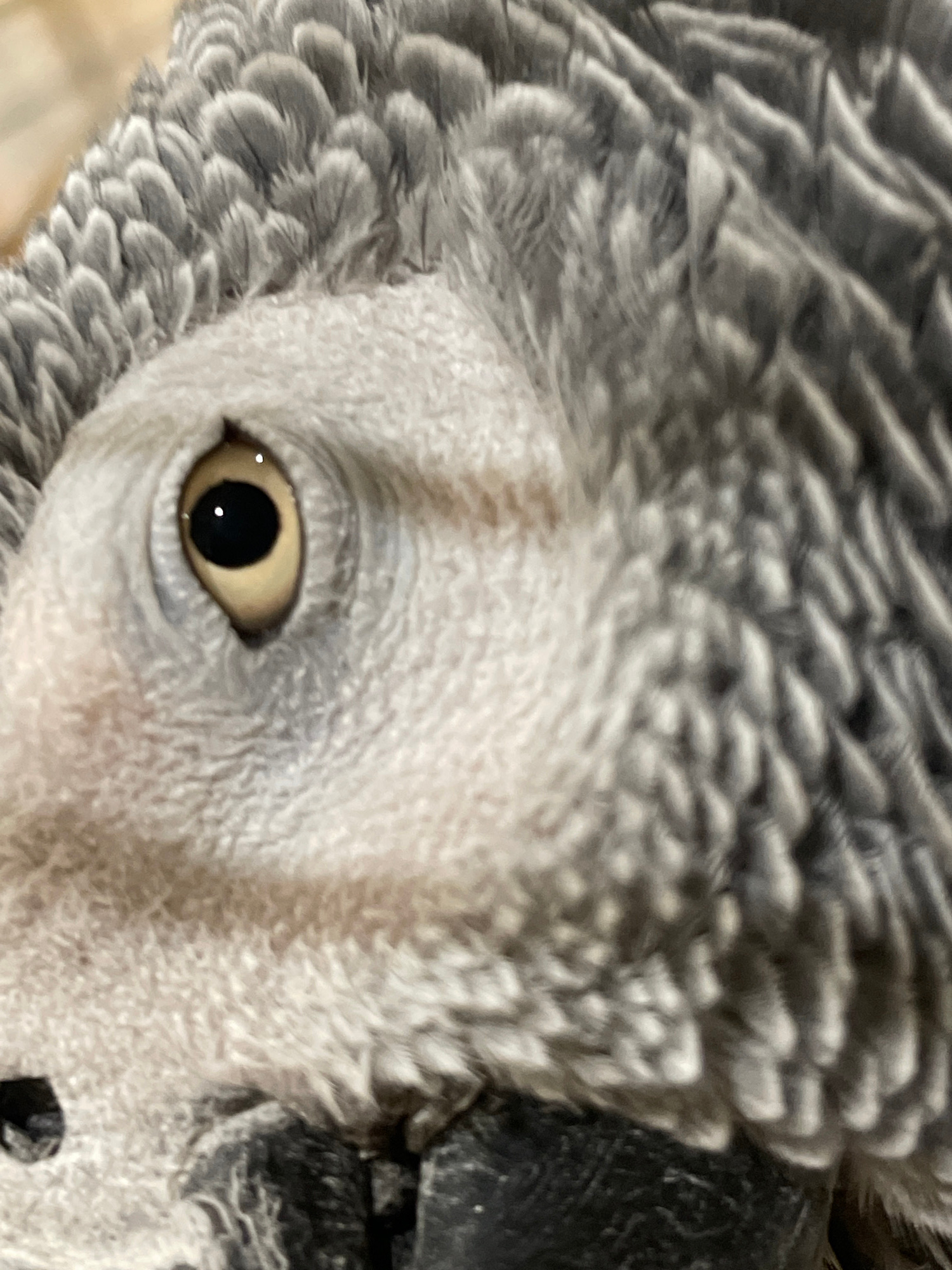 This is a close-up, matter-of-fact photographic depiction of the head of an African Grey Parrot, located in Ahronomichne, Ukraine. The primary subject is the bird's right eye, sharply in focus. The ey…read more