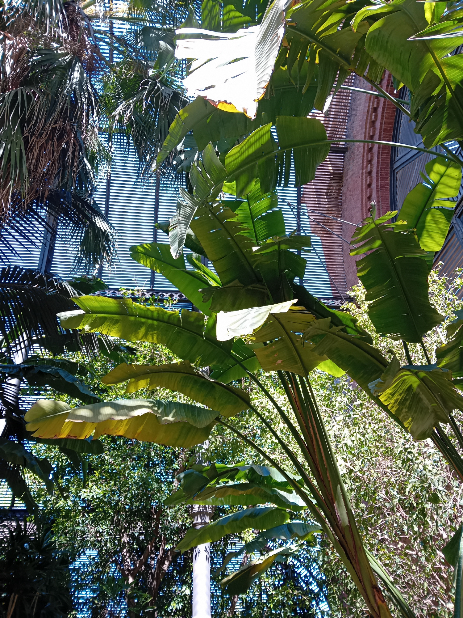 The image is taken looking up through tropical foliage at architectural structures, in Barcelona, Spain. The scene consists of a dense canopy of broad banana-like leaves, interspersed with the feather…read more