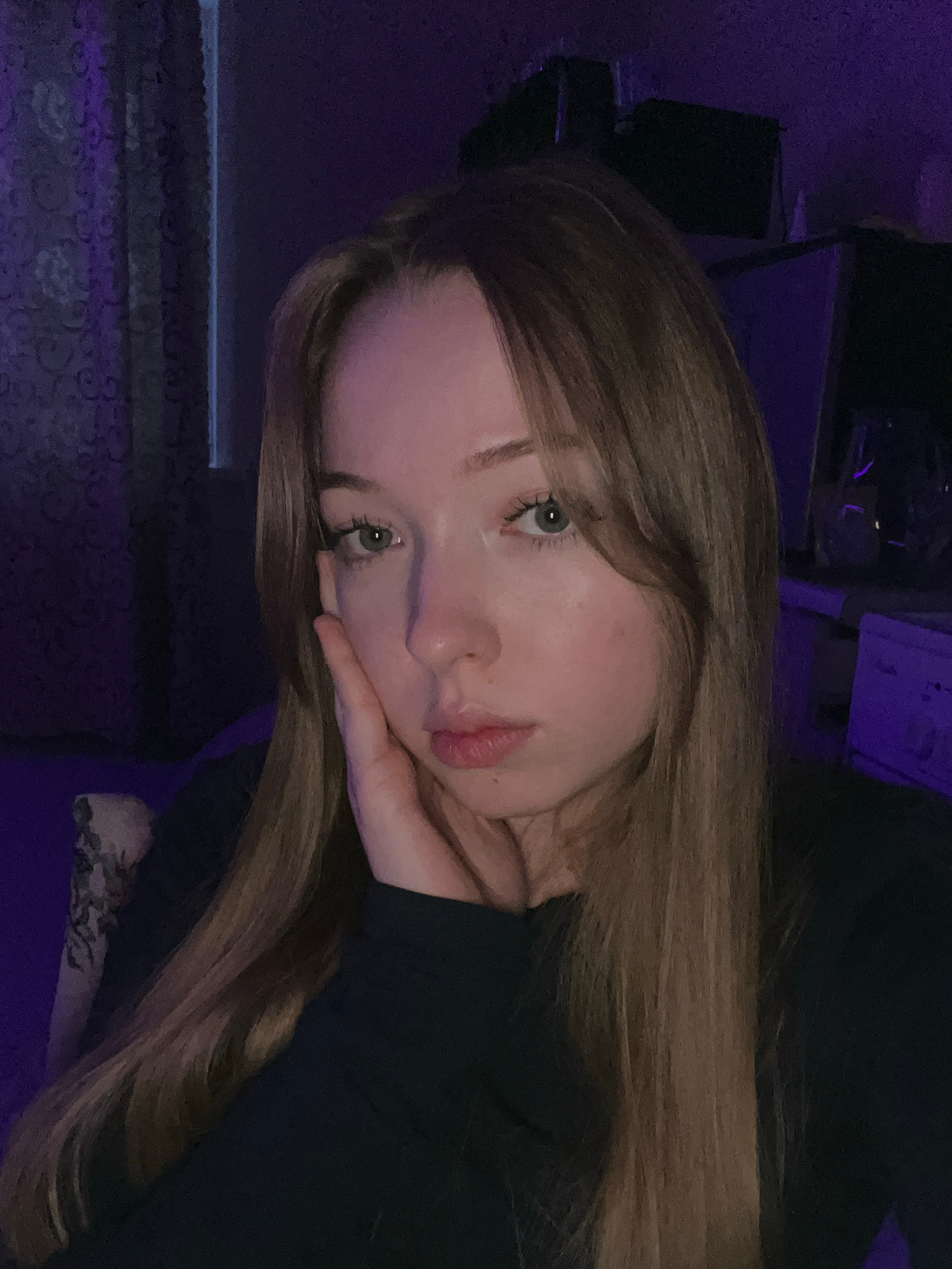 A woman with long brown hair is resting her face on her left hand. Her eyes are green and she has light skin. She is wearing a black shirt. Behind her are objects including a curtain or cloth and a piβ¦read more