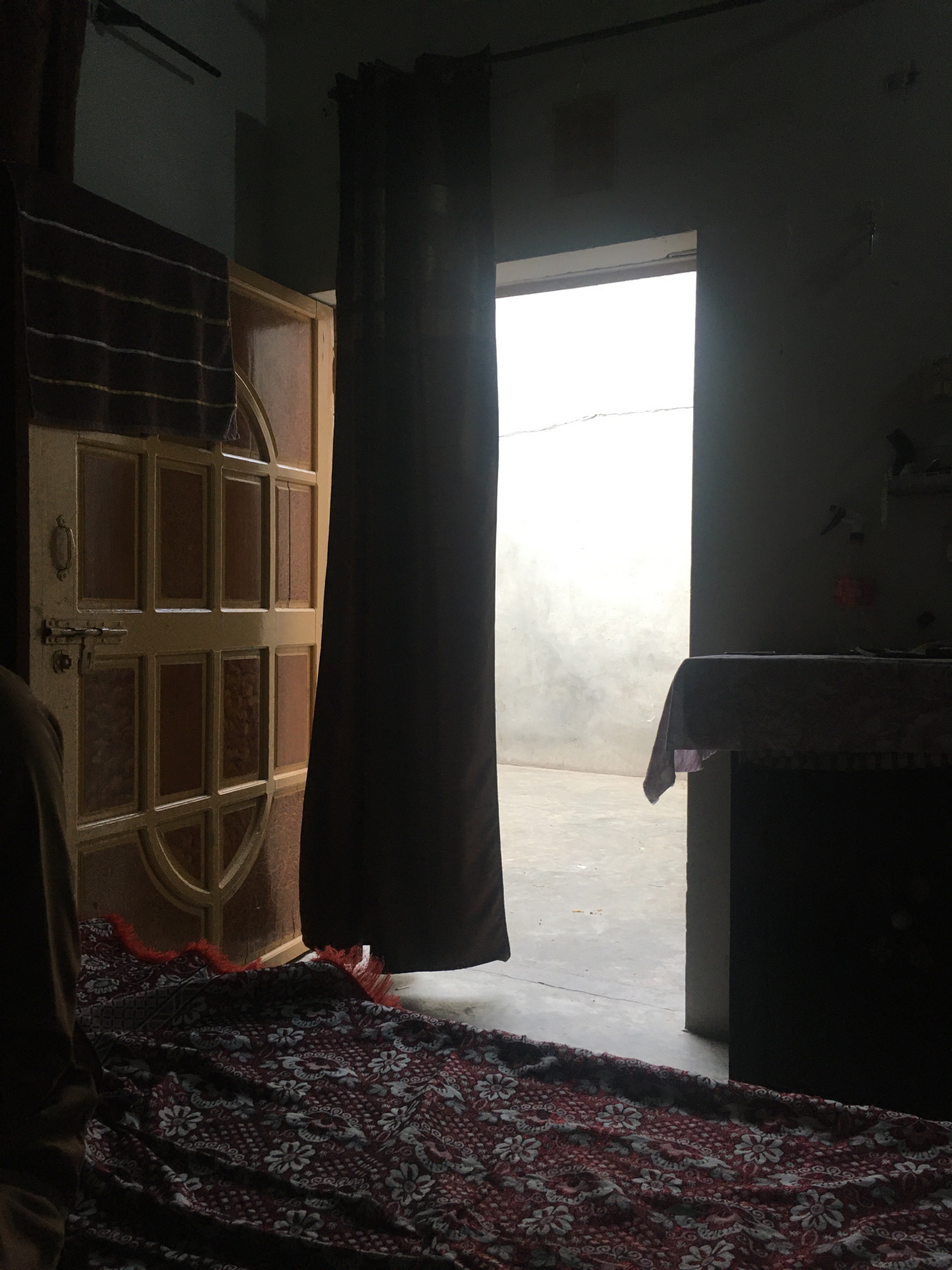 The image shows an interior view with a window or doorway leading to an outdoor area filled with bright light, possibly located in Karamsar, Pakistan. A curtain partially obscures the window, which is…read more