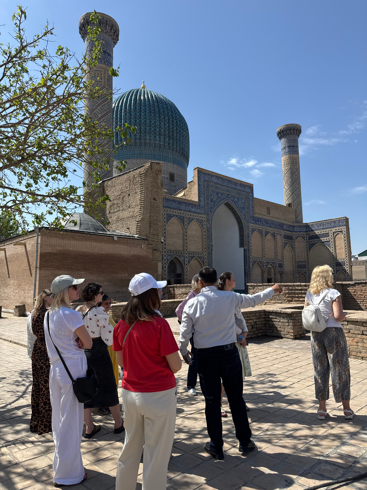 The image captures a group of tourists in Samarkand, Uzbekistan. They are standing in front of a building complex featuring a large, blue-tiled dome and two minarets. The building is adorned with intr…read more