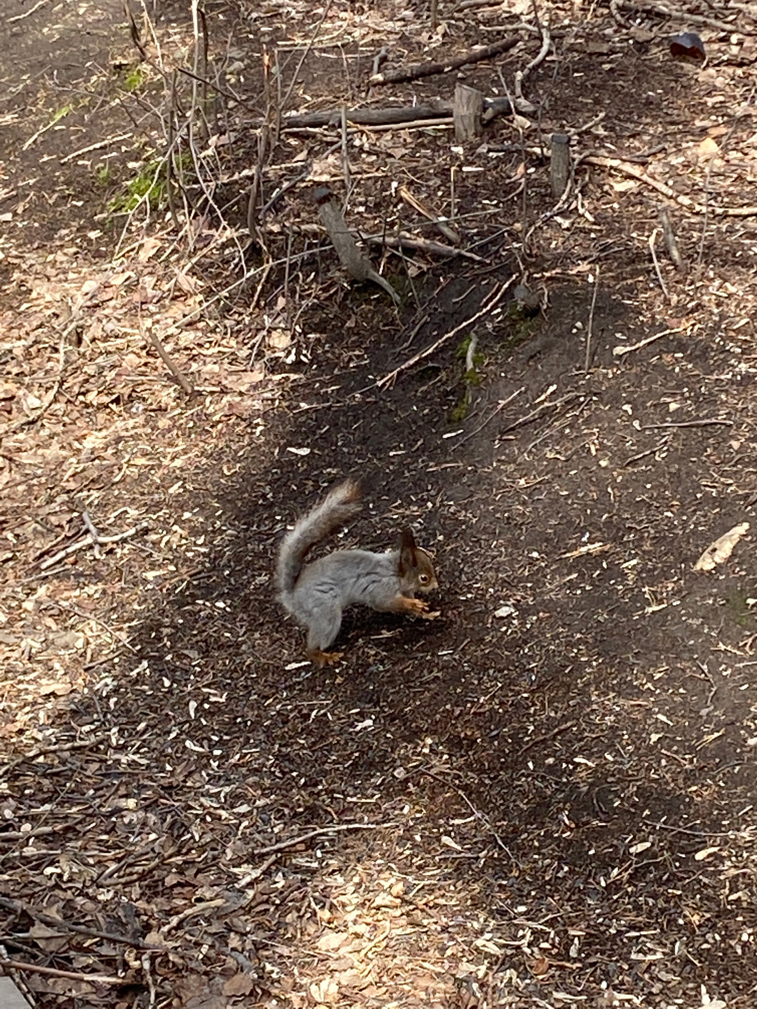 A dead squirrel lies on a ground covered with twigs, leaves, and debris. The squirrel is gray with a bushy tail, positioned in the center of the image. The ground appears to be in a wooded or natural…read more