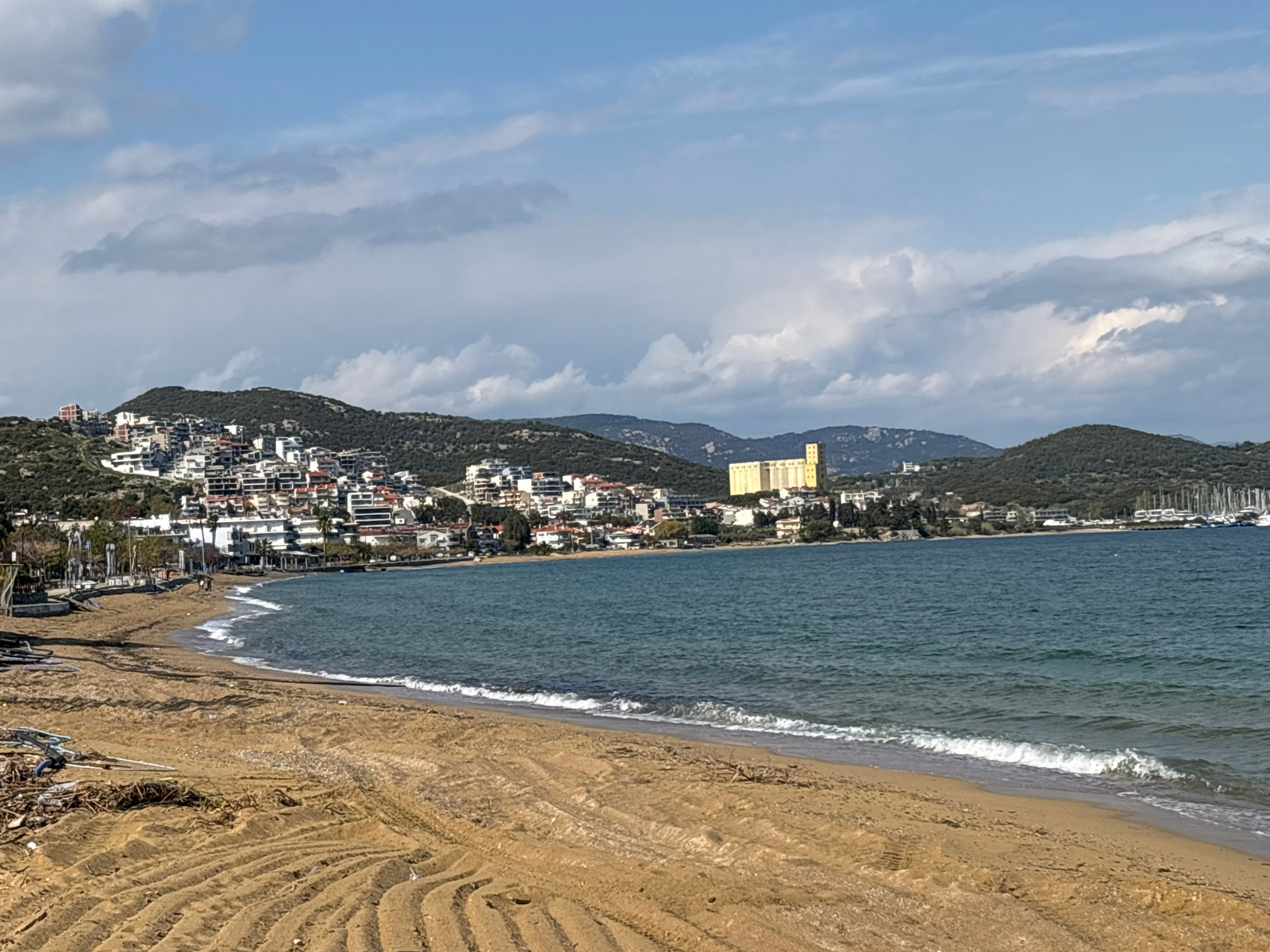 The image shows a wide sandy beach on the coast of Nea Peramos, Greece. Tire tracks are visible in the sand near the foreground, and debris is scattered on the left side of the beach. The sea is a blu…read more