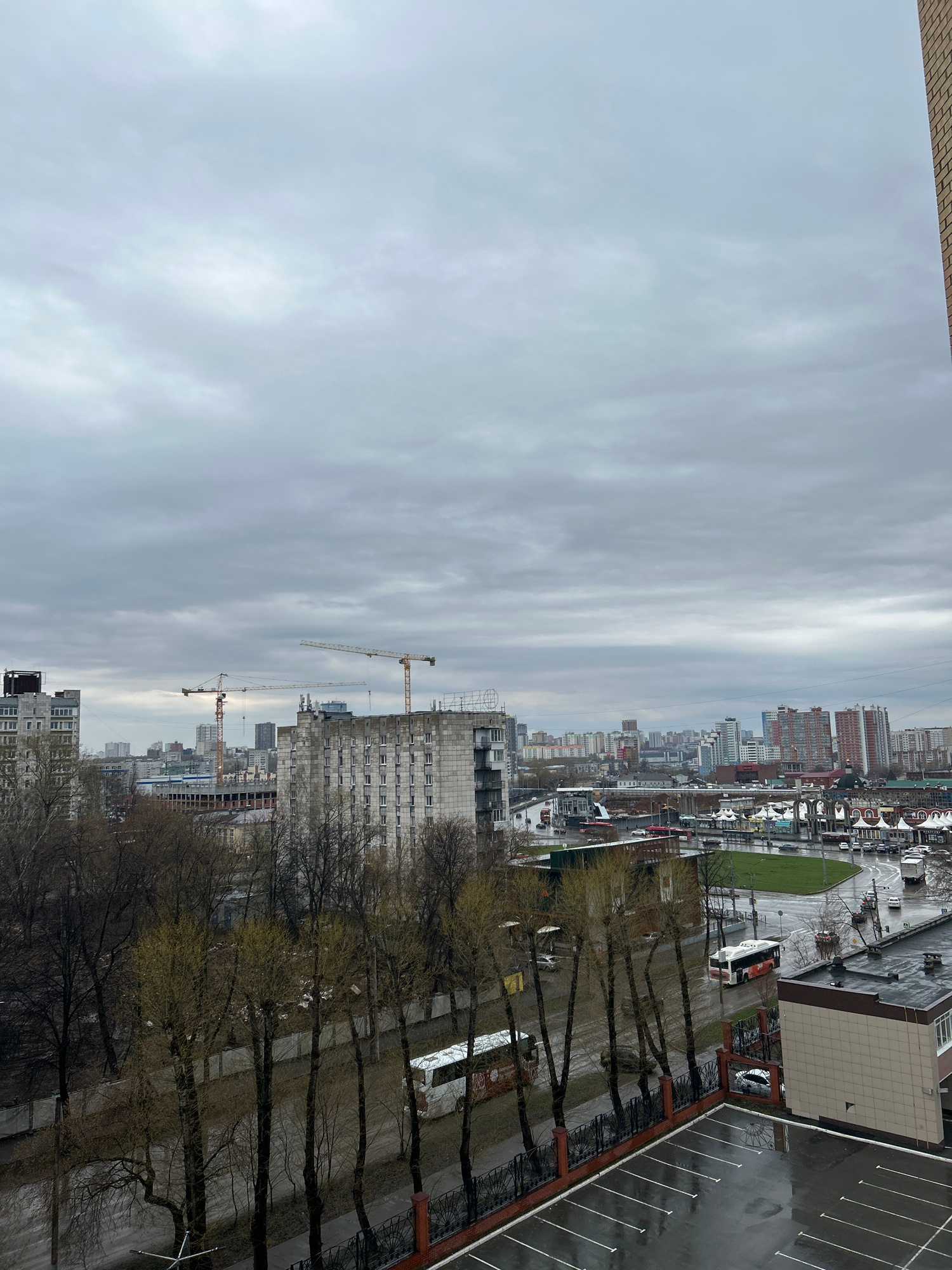 An aerial view of Perm, Russia presents a cloudy sky over a city. The ground below is partially obscured by rows of bare trees. A building under construction is visible, complete with cranes. A parkin…read more