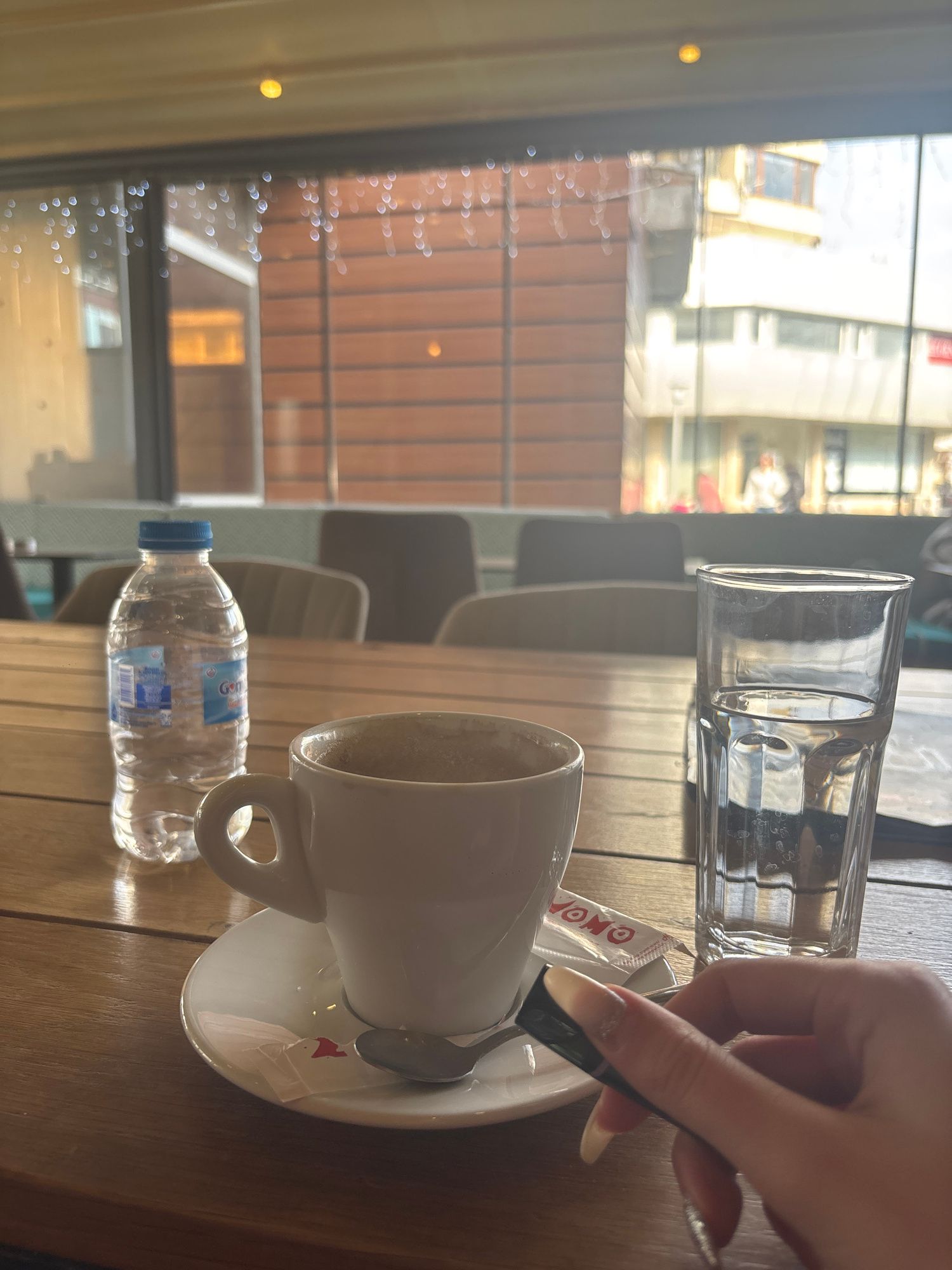 A close-up shot shows a coffee cup on a saucer with a spoon, next to a water bottle and a glass of water. A hand is partially visible in the upper right corner holding the spoon. The scene is set on a…read more