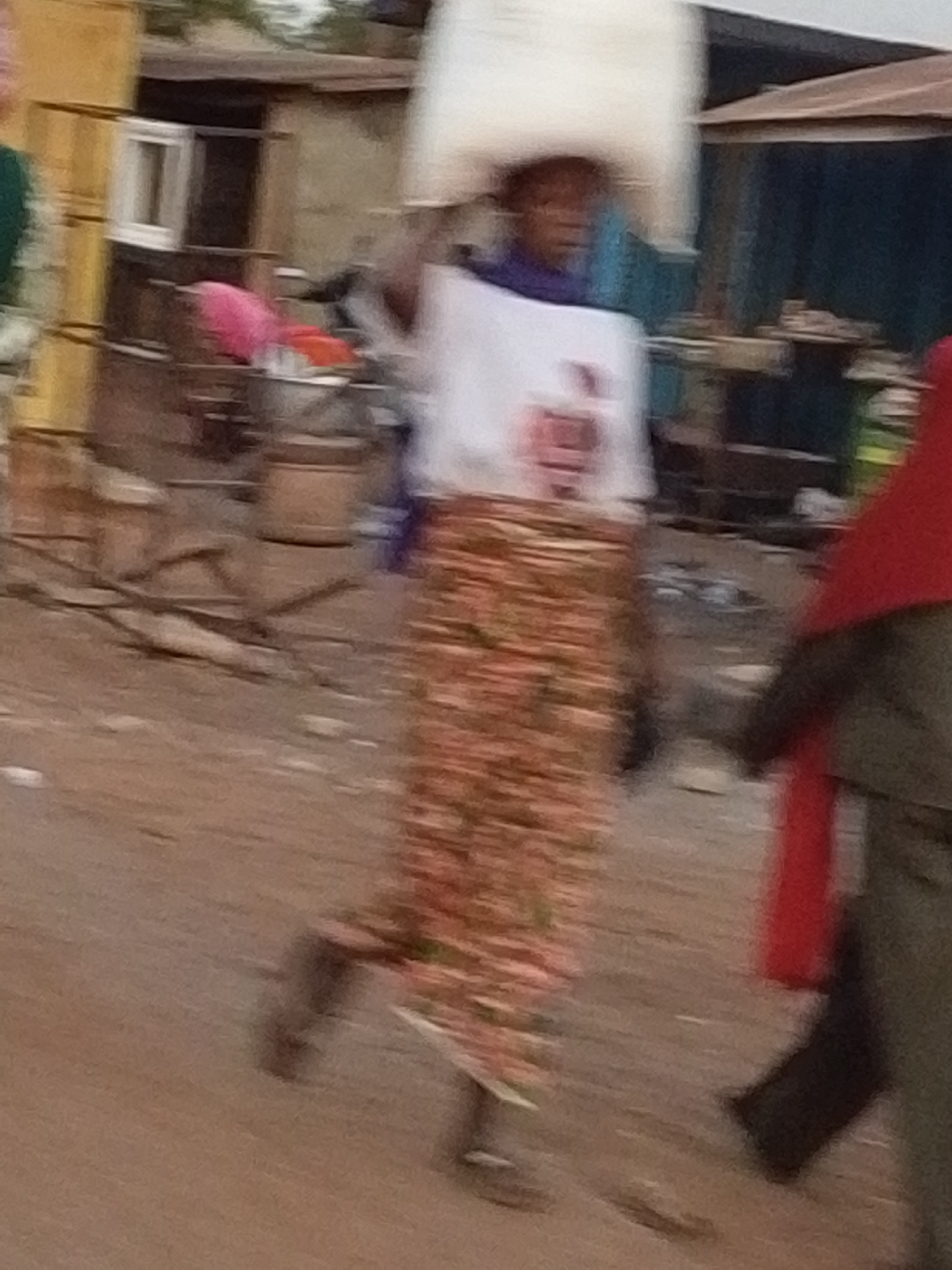 A woman is carrying a large white bag on her head while walking on a dirt road in Tamale, Ghana. She is wearing a long patterned skirt and a white t-shirt. A person wearing a red headscarf is walking…read more