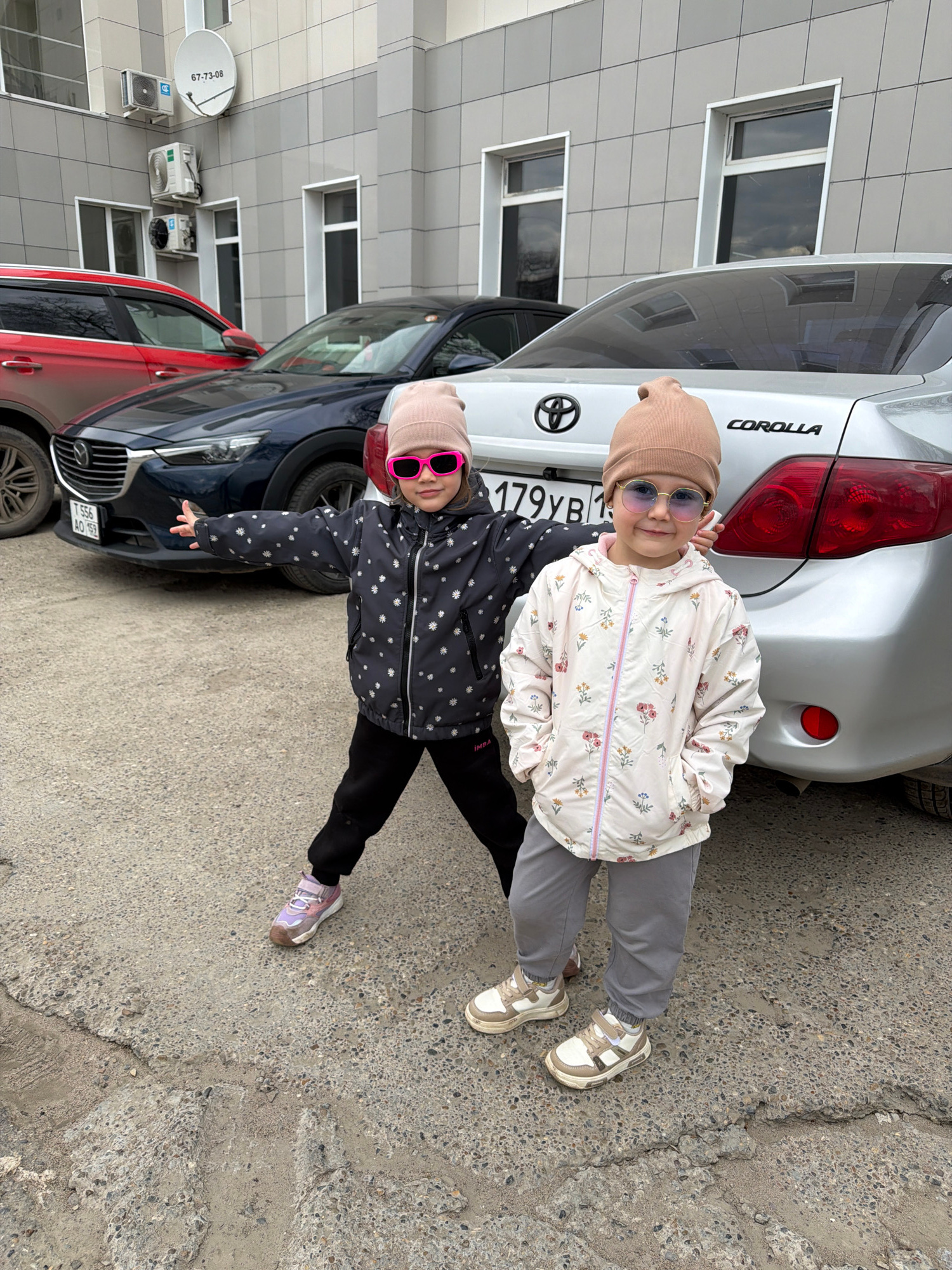Two young girls, dressed in cool-weather attire, stand side-by-side on an asphalt surface in what appears to be a parking area in Chaikovsky, Russia. The image is oriented sideways, but depicts the gi…read more