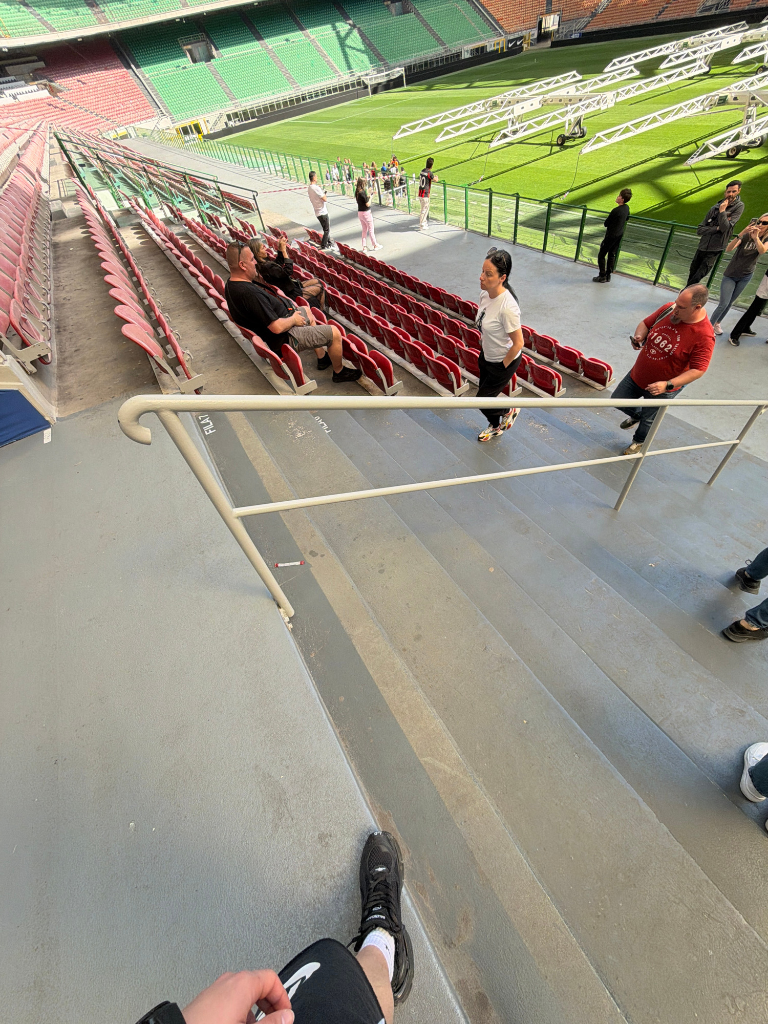 The image depicts the interior of San Siro stadium in Milan, Italy. The view is from an elevated position on concrete steps, looking down towards the stadium. Several people are visible in the stands,…read more